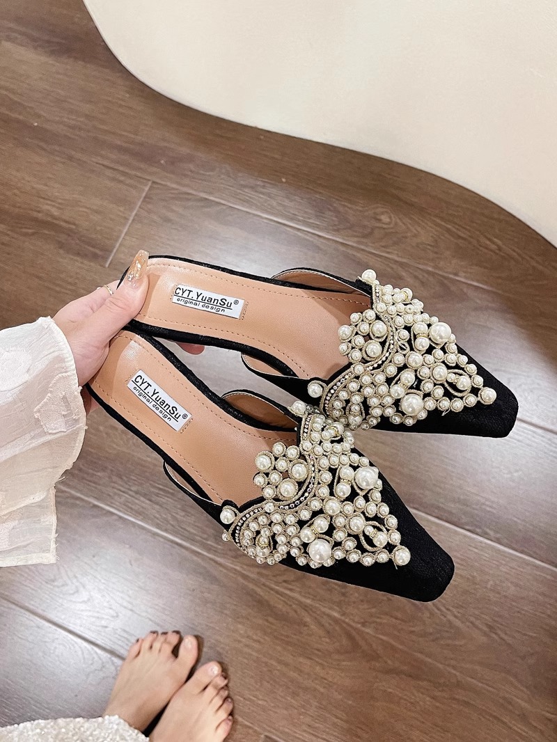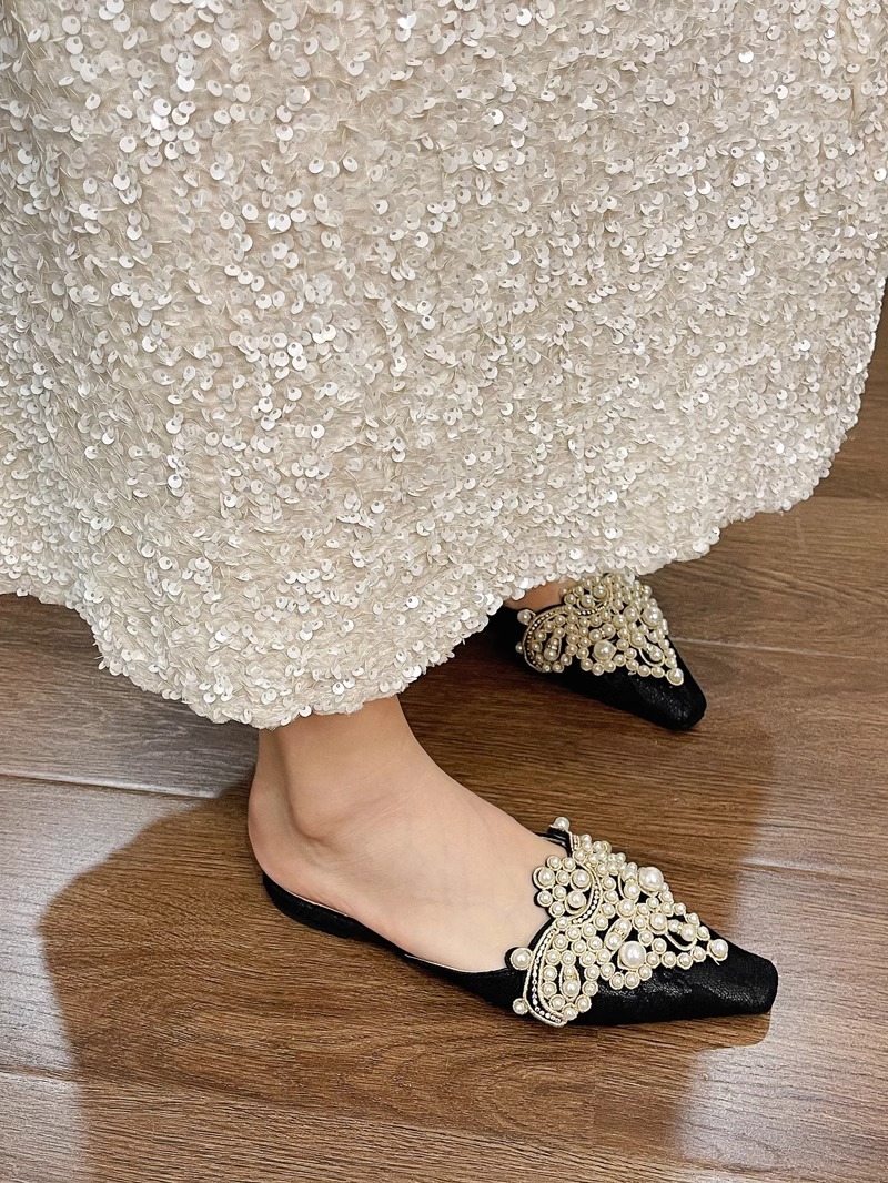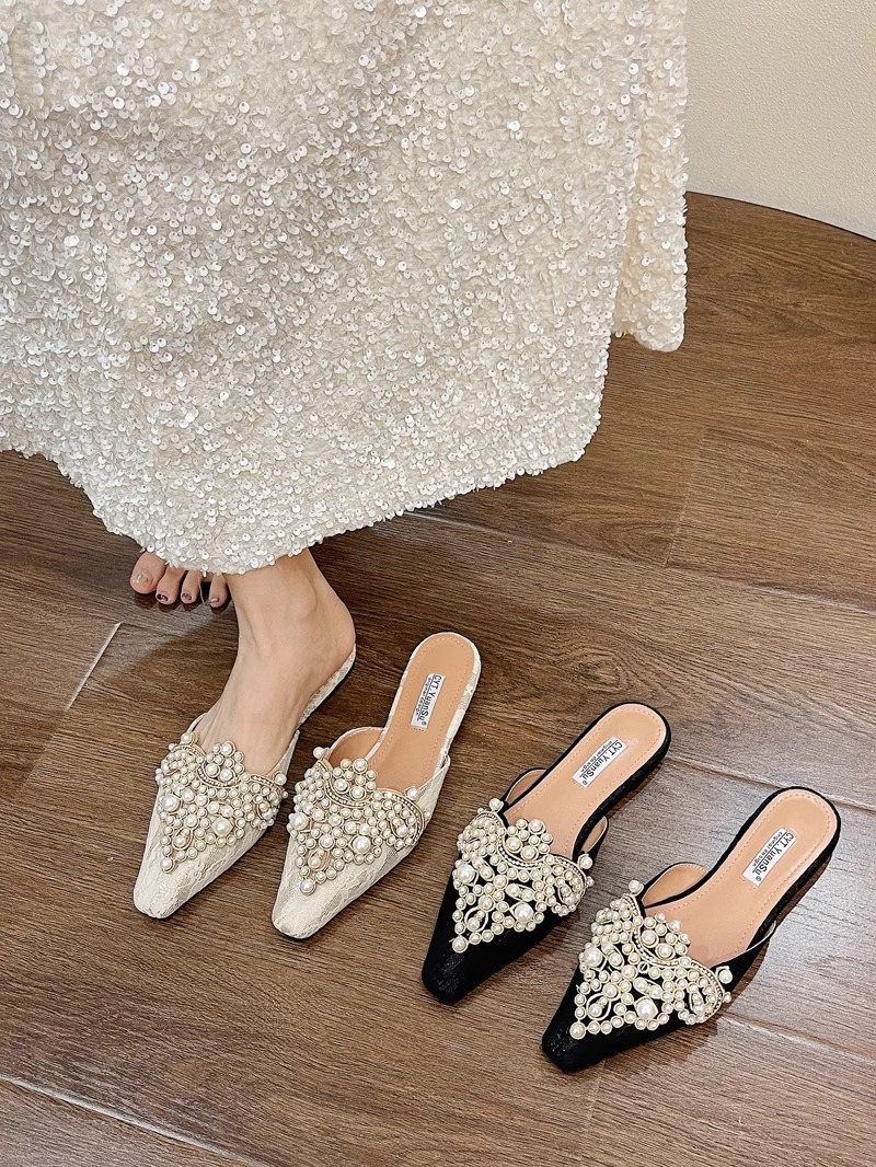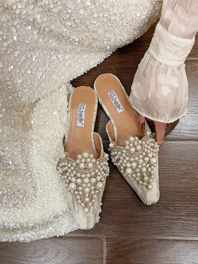 中国風包頭レースのウェディングシューズハーフスリッパ女性のための 2025 春夏新作アウターウェア多用途パールラインストーンレイジーサンダル