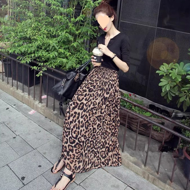 気質シフォンヒョウ柄スカート、プリーツスカート、女性用大振りスカート、オールシーズン万能、スリムでスリムなダンスロングスカート、高級
