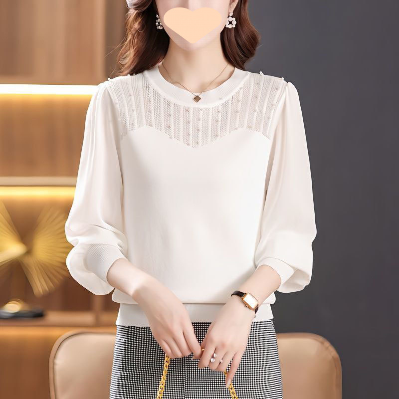 韓国風レースシフォンシャツ長袖中空ビーズニットトップ女性ニッチデザインお腹カバーボトリングシャツトレンディ