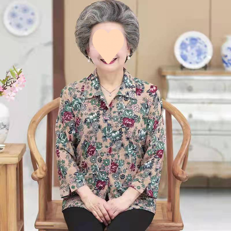 中高年女性の春秋シャツ、長袖おばあちゃんラペルアイスシルクシャツ、おばさんママルーズトップス