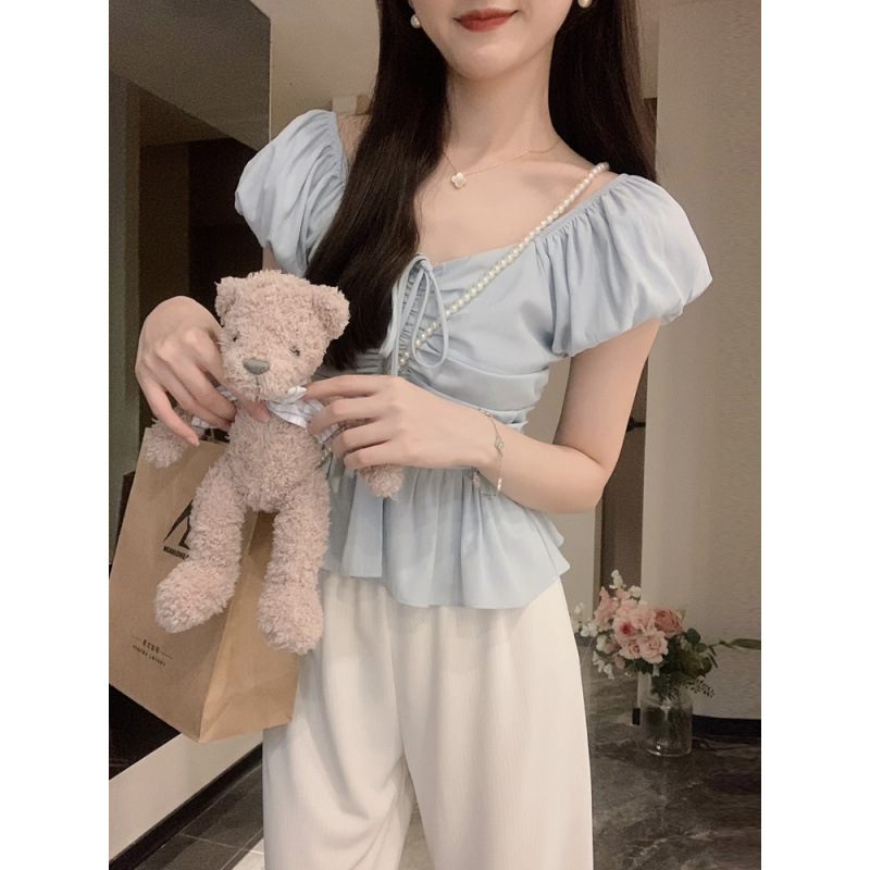フレンチスイートパフスリーブシャツ女性のための夏の2025新しいデザインニッチ気質ウエストトップ