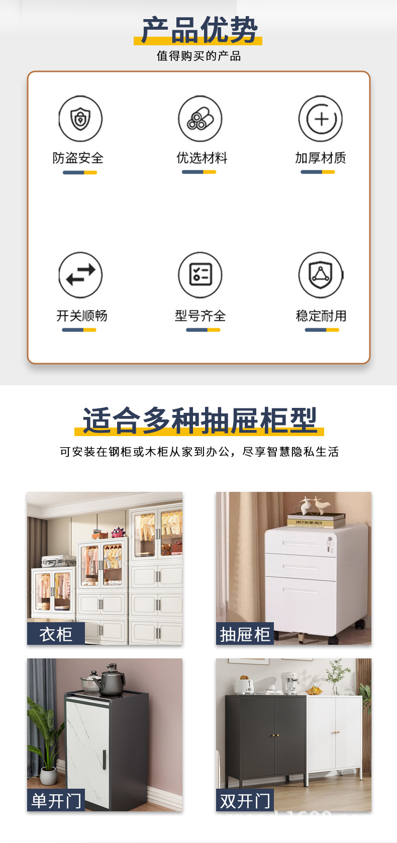 抽屉指纹锁电子智能文件柜子双开柜门锁置物柜鞋柜衣柜密码信箱锁