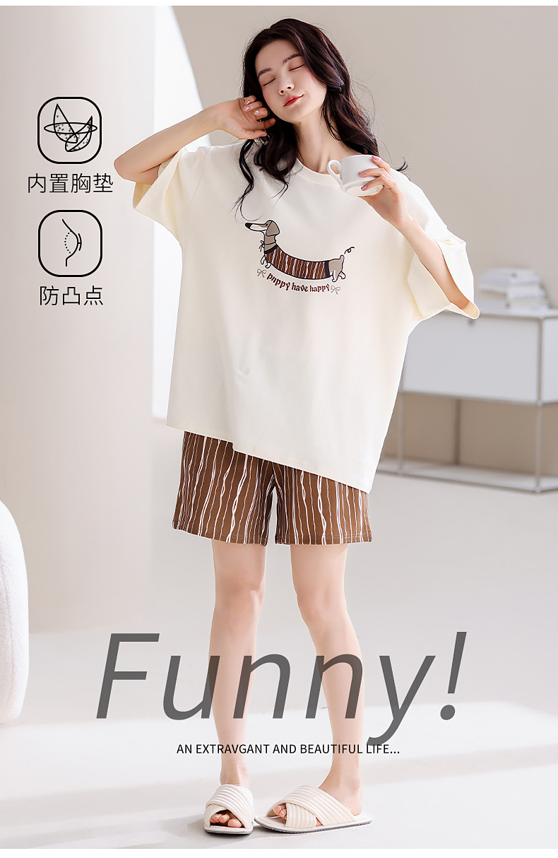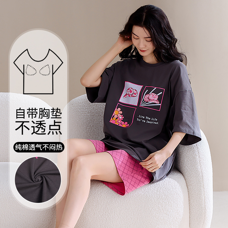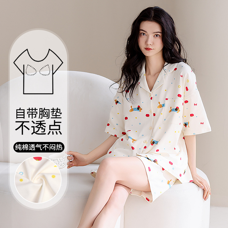 女性用胸パッド付きパジャマ、夏用純綿半袖ショーツ、薄手の大きいサイズ、甘いカジュアル、屋外で着用可能、ホームウェアセット