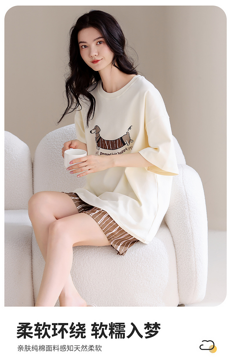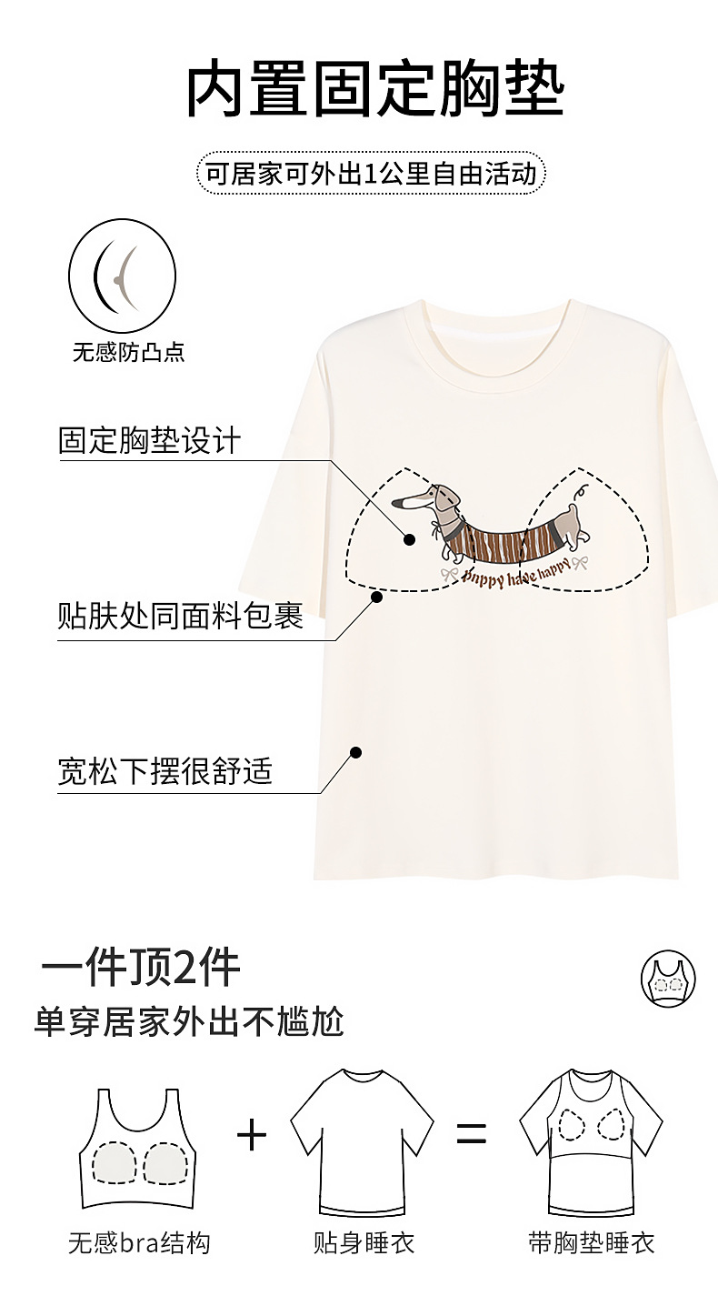 胸パッド付き女性用純綿ナイトガウン、夏用薄い漫画甘いパジャマ、半袖、夏に屋外で着用可能、ホームウェアセット