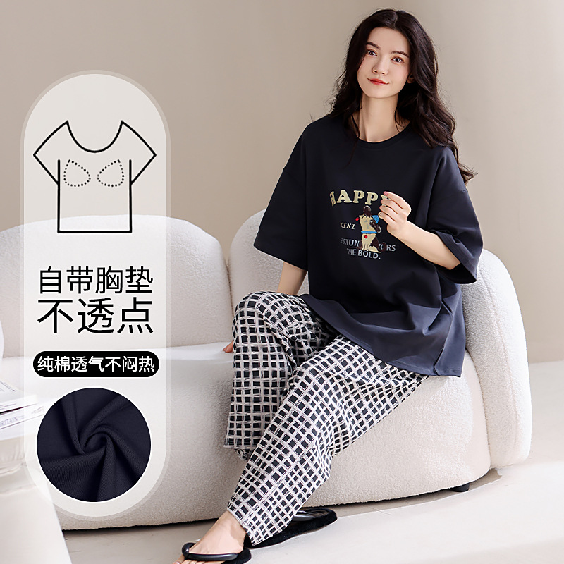 パジャマ女性夏純綿半袖長ズボン2025年新型純綿薄手夏胸パッド付き可愛いホームウェア
