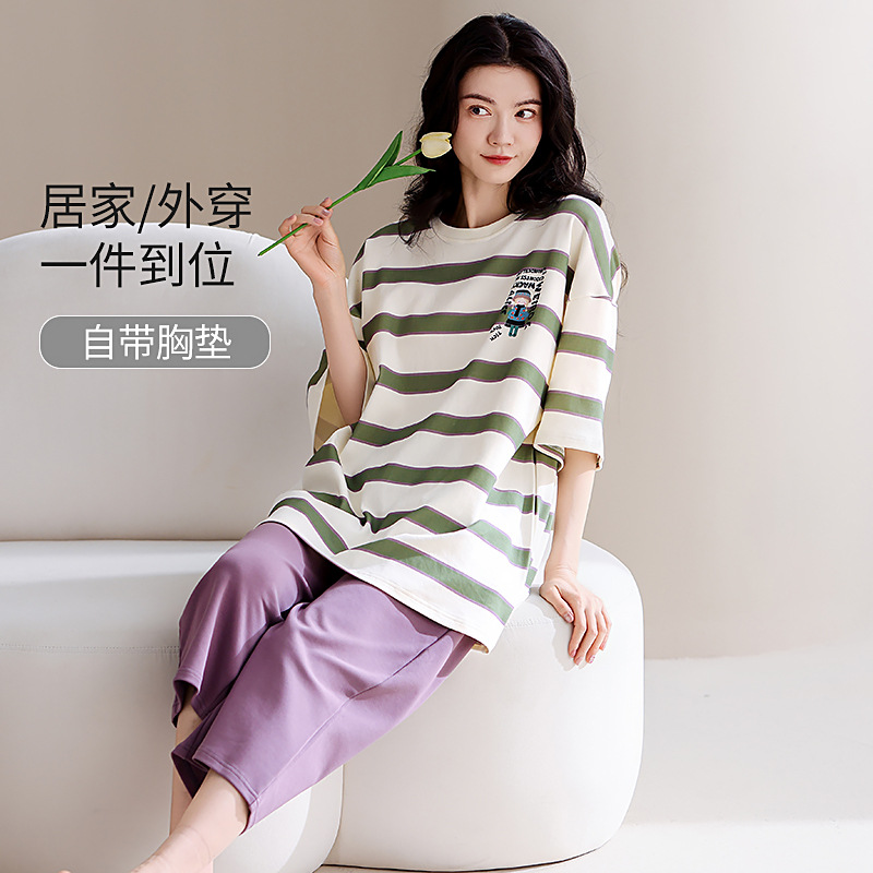 胸パッド付きの女性用純綿パジャマ、半袖ズボン、2025年夏の新しい薄い夏のホームウェアセット、屋外で着用可能