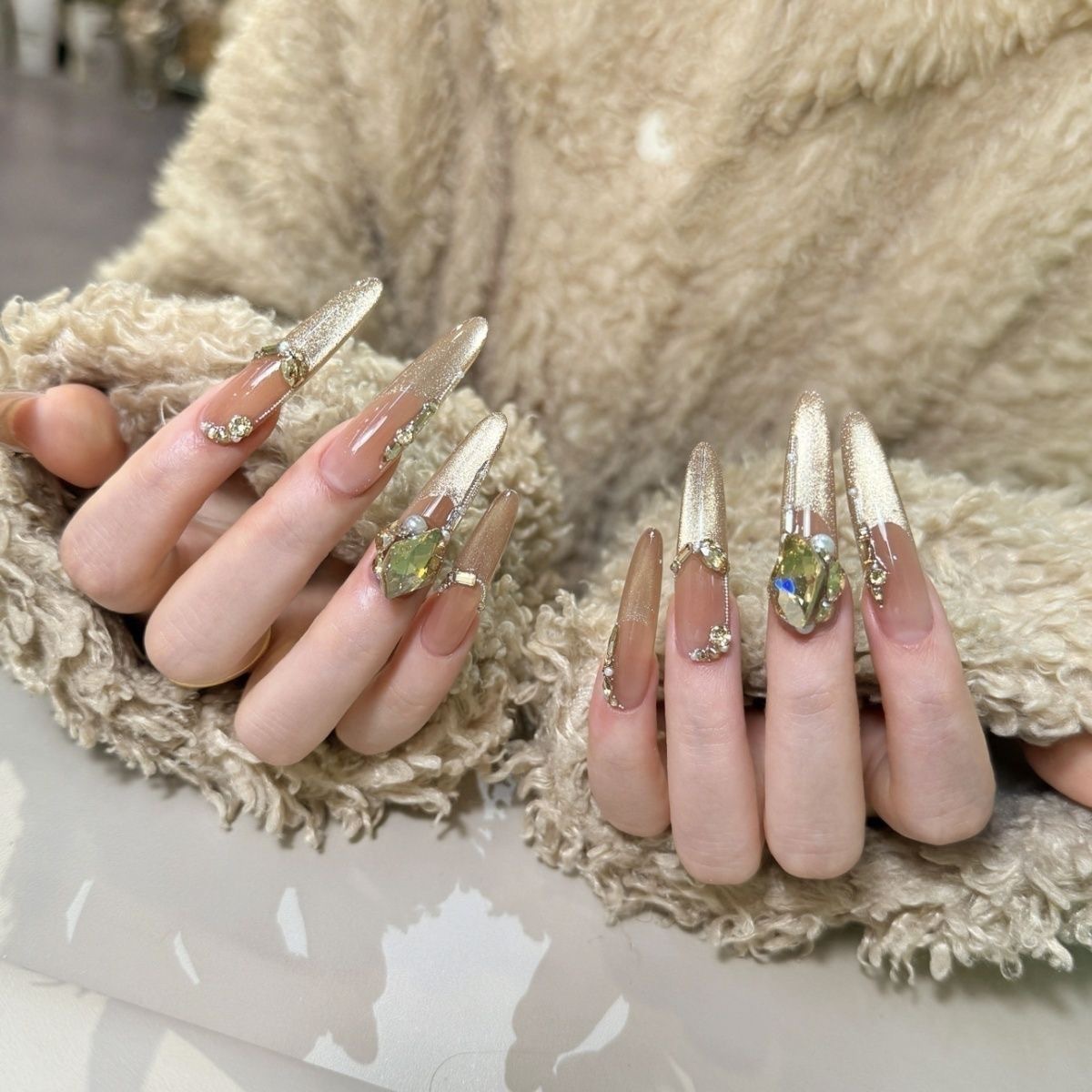 纯手工穿戴甲温柔风裸杏色香槟碎钻美甲显白气质细狗长尖秋冬款