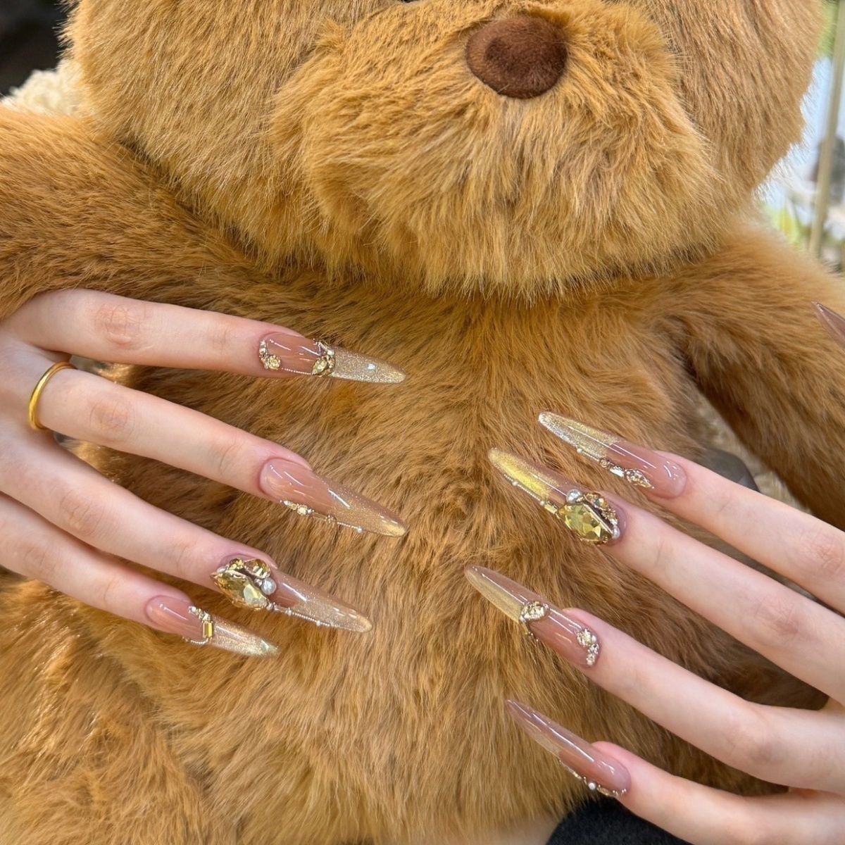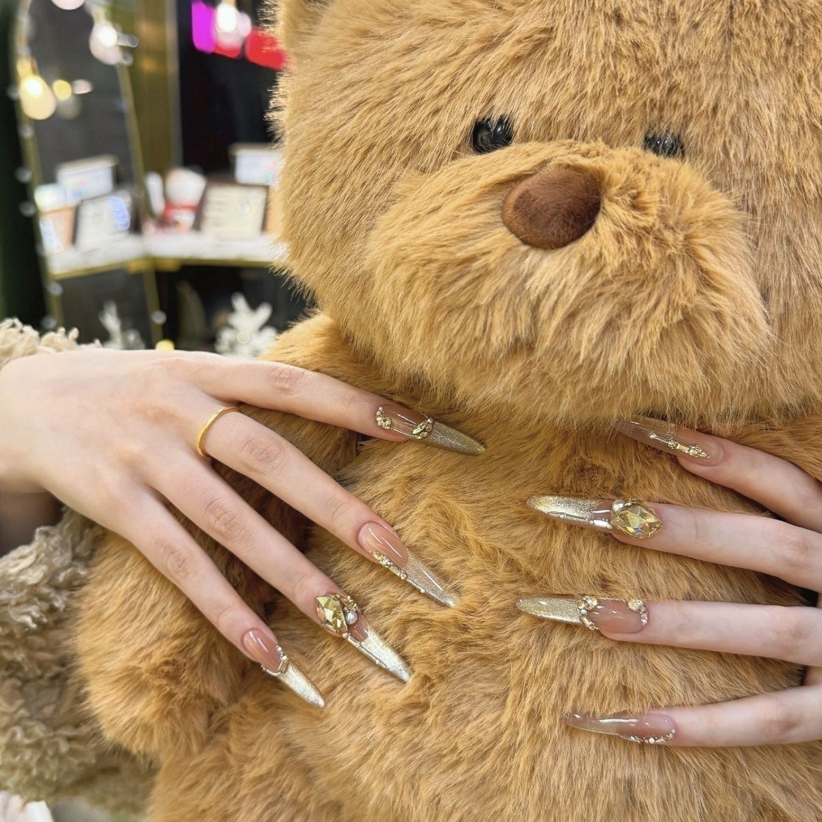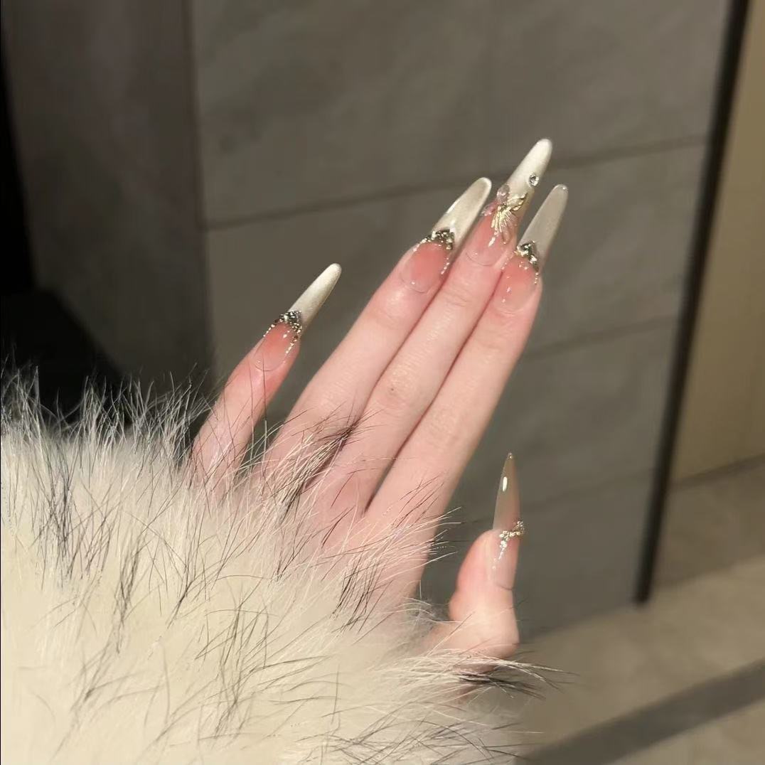 气质仙女美甲透裸色穿戴甲法式猫眼奢华大钻长款细狗美甲纯手工