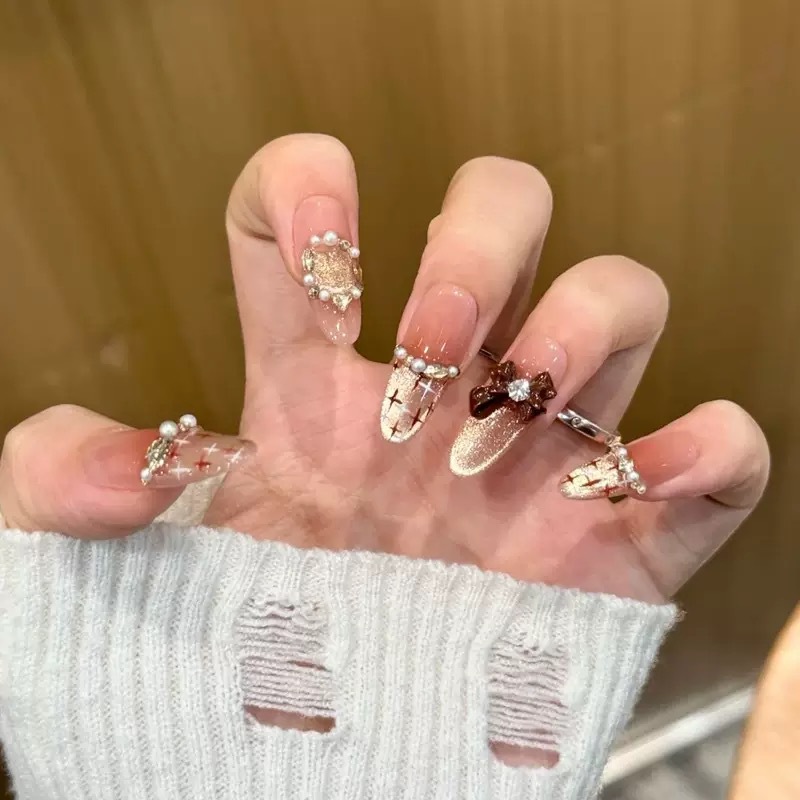 純粋に手作りされた細い犬の長い猫目真珠の氷透明ウェアラブルネイル完成品卸売ウェアラブルネイル取り外し可能