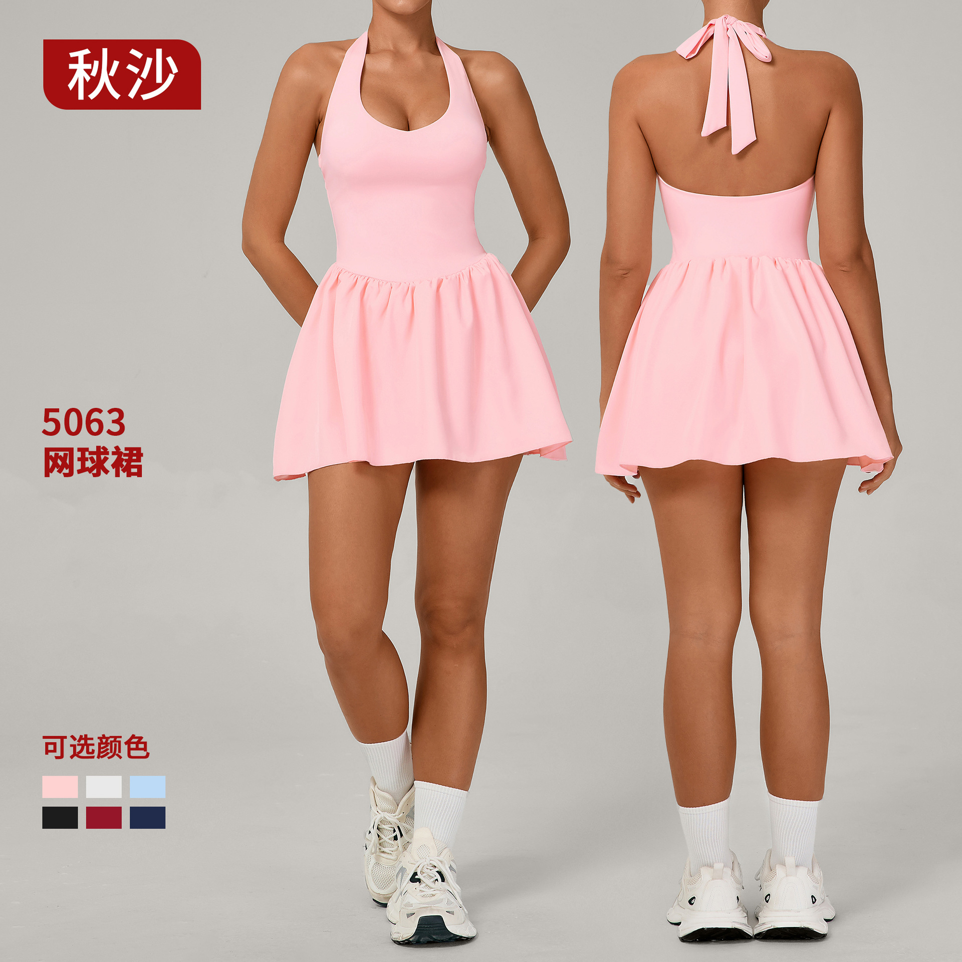 欧美大露背运动连衣裙女防走光百褶瑜伽裙户外健身网球裙 3928