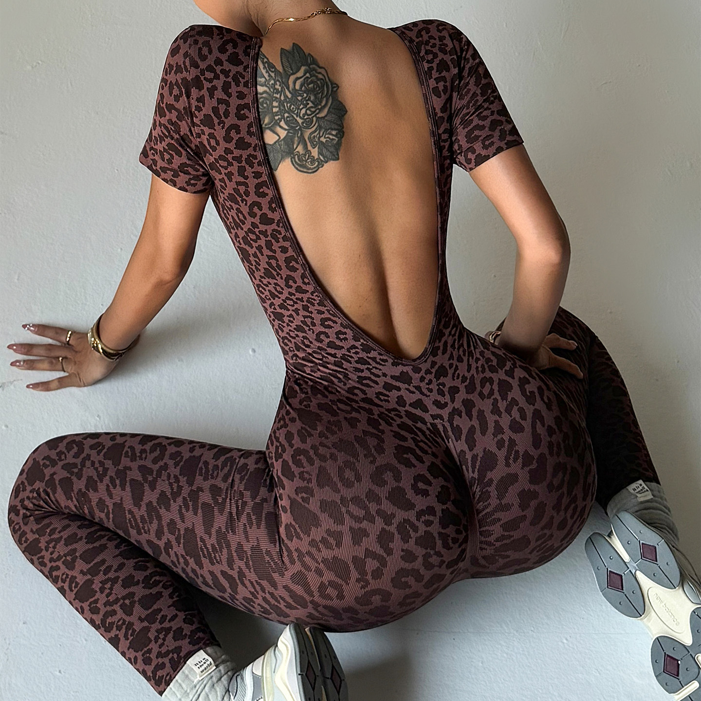 欧美跨境新款瑜伽连体衣豹纹漏背短袖修身户外运动瑜伽服