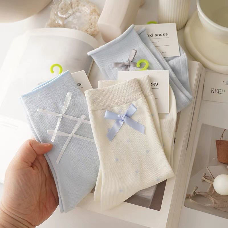 夏のレディースソックス、耳付きリボンミッドカーフソックス、インリボンパイルソックス、かわいいレトロミッドカーフソックス