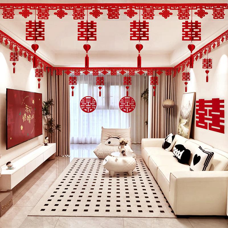 ウェディング用品、ハッピーワードラテアート、新居装飾シーンレイアウト、部屋、リビングルーム、ベッドルーム、ウェディングルームセット、ロマンチックなウェディングカーテン