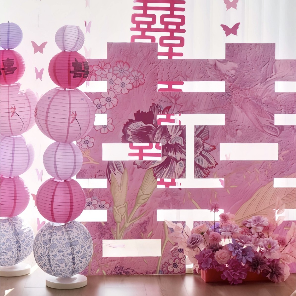 紫色のウェディングルーム装飾セット、結婚式の背景壁装飾、「喜」の文字、床置きの婚約祝いの文字、モーニングローブ撮影