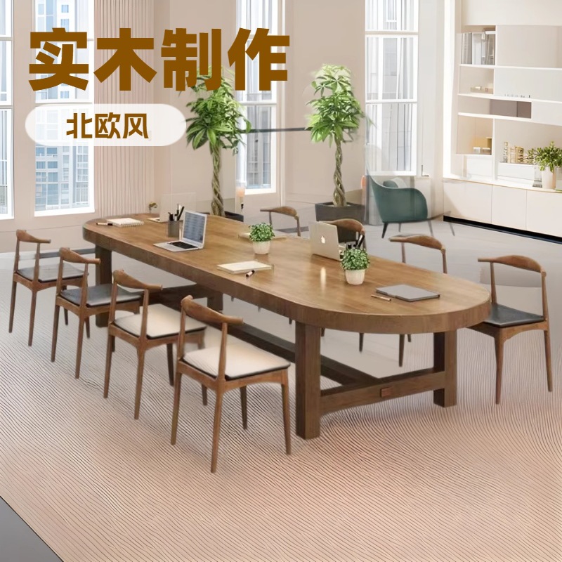 モダンでシンプルな無垢材のデスク、楕円形のパイン材のロングテーブル、ログマルチパーソンミーティングスタジオのテーブルと椅子