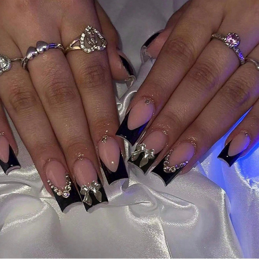 クロスボーダーの新型手作り高級装い甲銀色の金属の蝶結びのドリルの甘い黒い辺の甲のフランスの黒い辺の甲