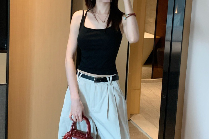 ギャルのしわの細い肩に小さいサスペンダーのベストを持っています。