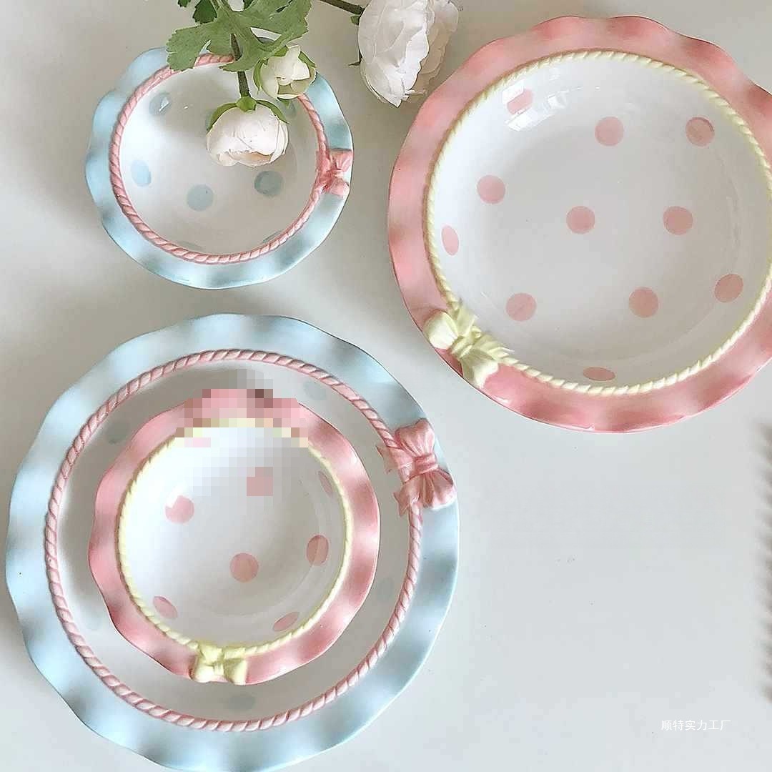 Ins風韓国式少女心陶磁器食器セット波点蝶結びかわいい茶碗茶碗深皿