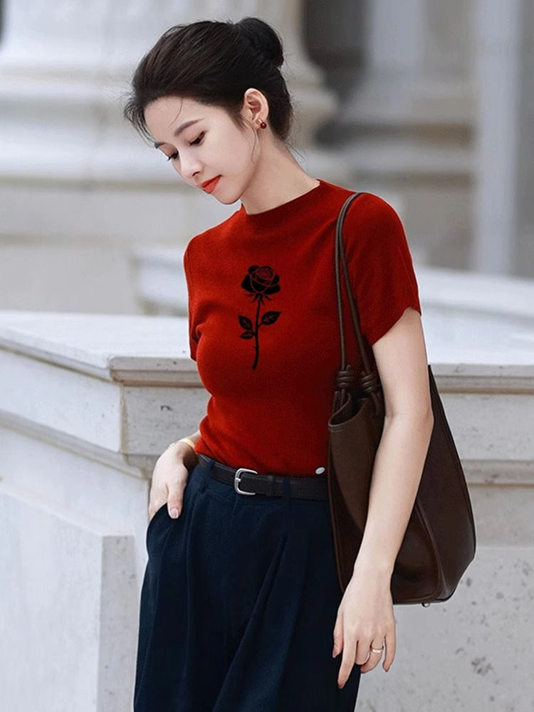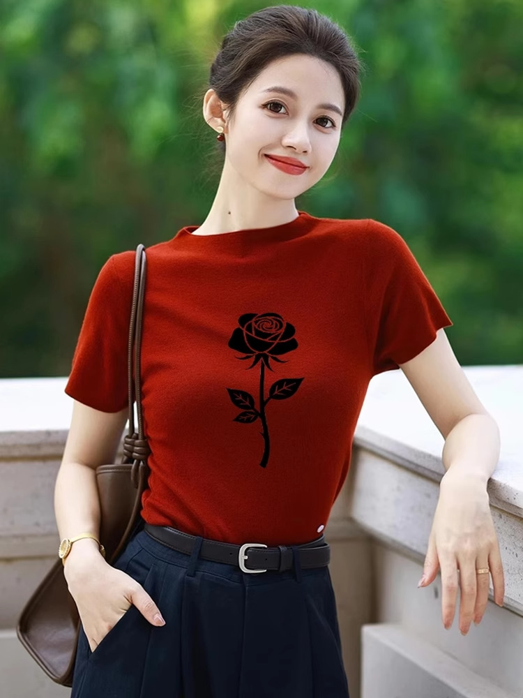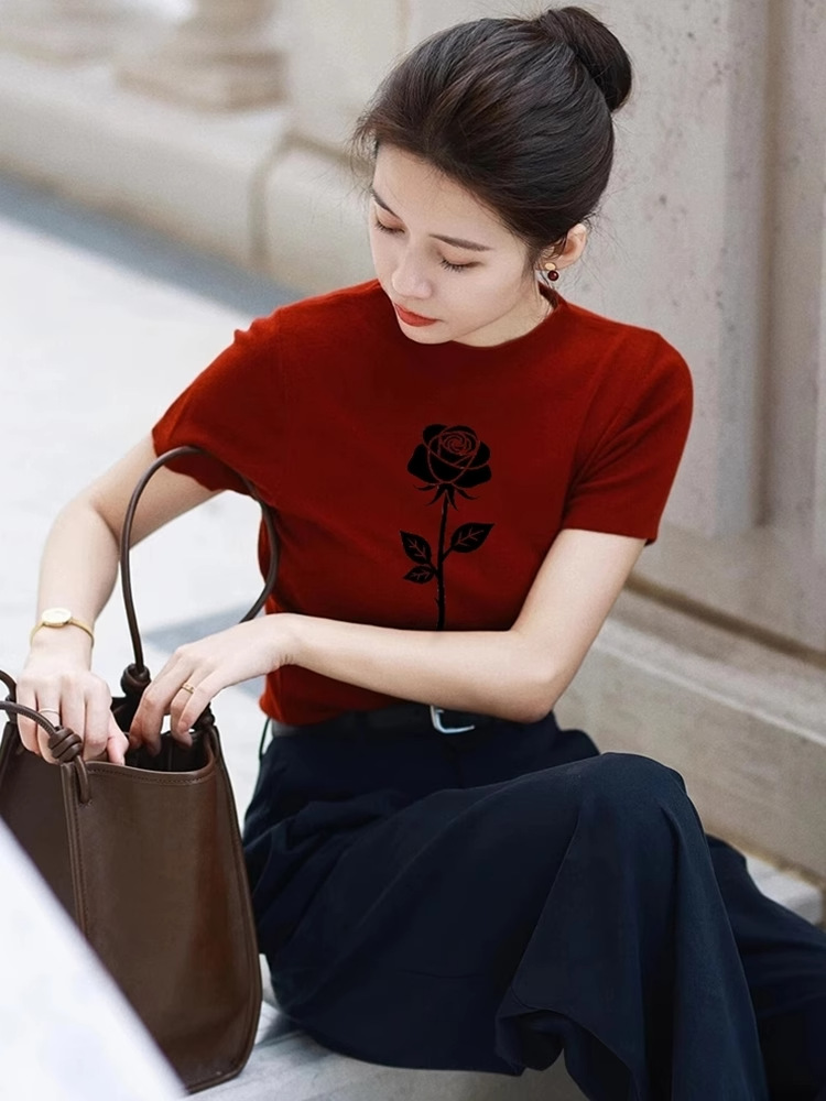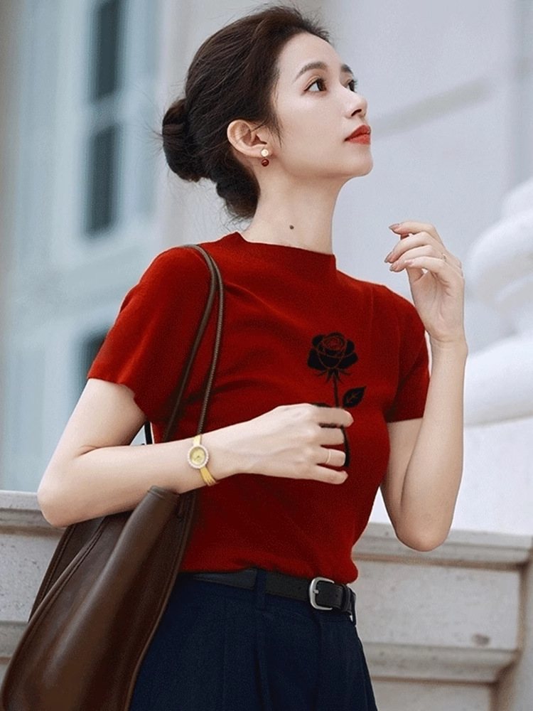Gejia モールの同じスタイルの女性の 2025 夏香港スタイルのレトロな赤いニットローズ半袖 T シャツトップ女性用