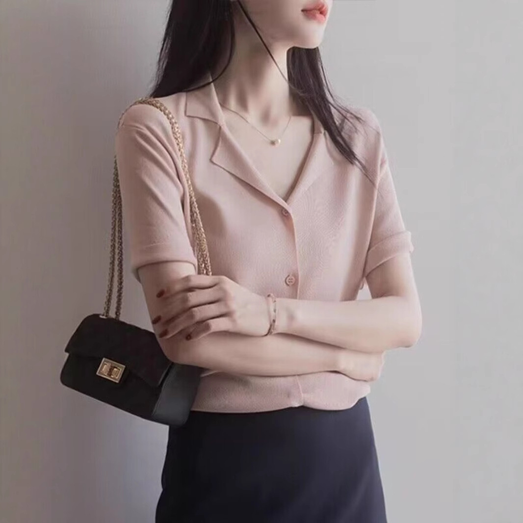 Gejia モールの同じスタイルの女性の 2025 夏ポロ襟アイスシルクニットカーディガントップ夏薄い半袖女性