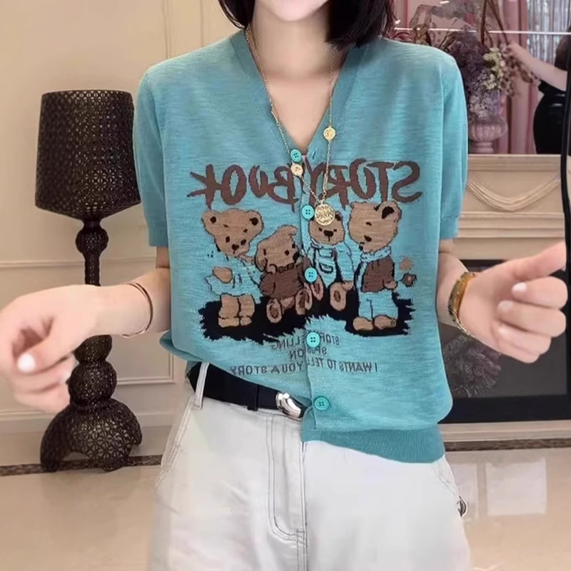 Gejiaショッピングモールの同スタイルレディース2025夏クマプリントVネック半袖Tシャツゆったりカバー肉シャツ西洋風女性