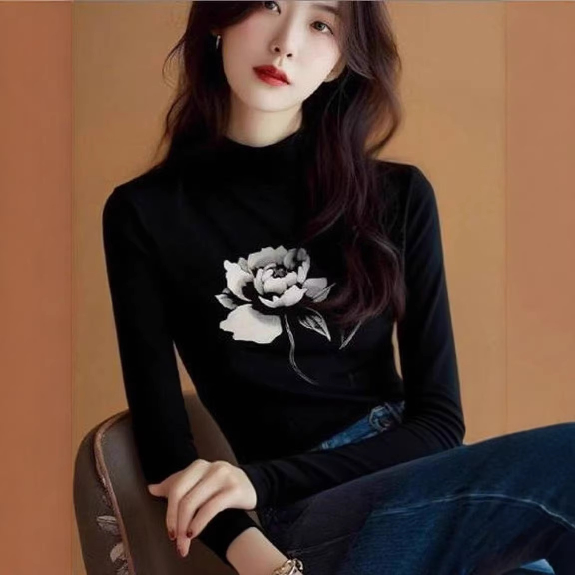 专柜品质秋季新款黑色玫瑰花绣花时尚百搭半高领修身打底T恤女士