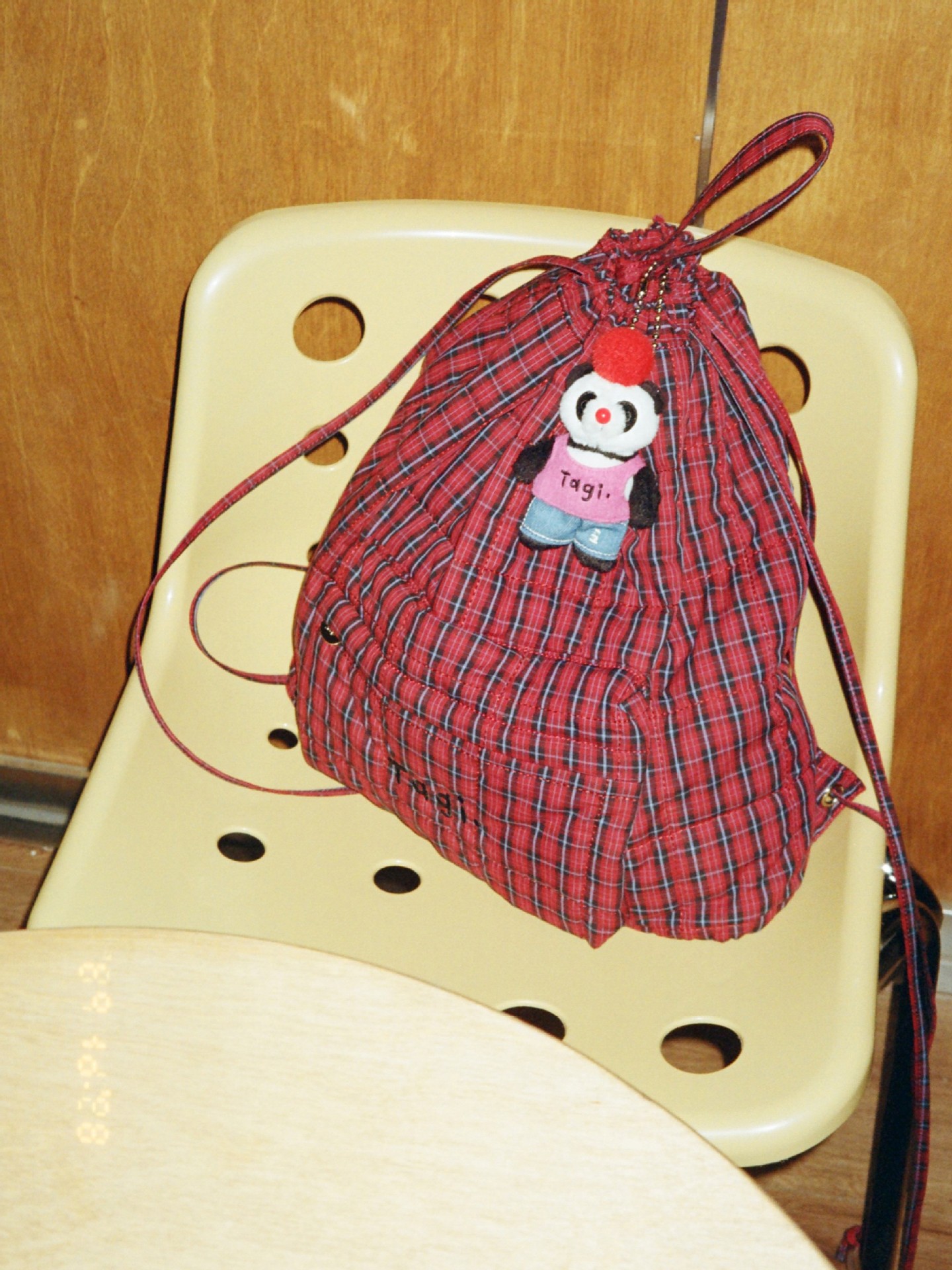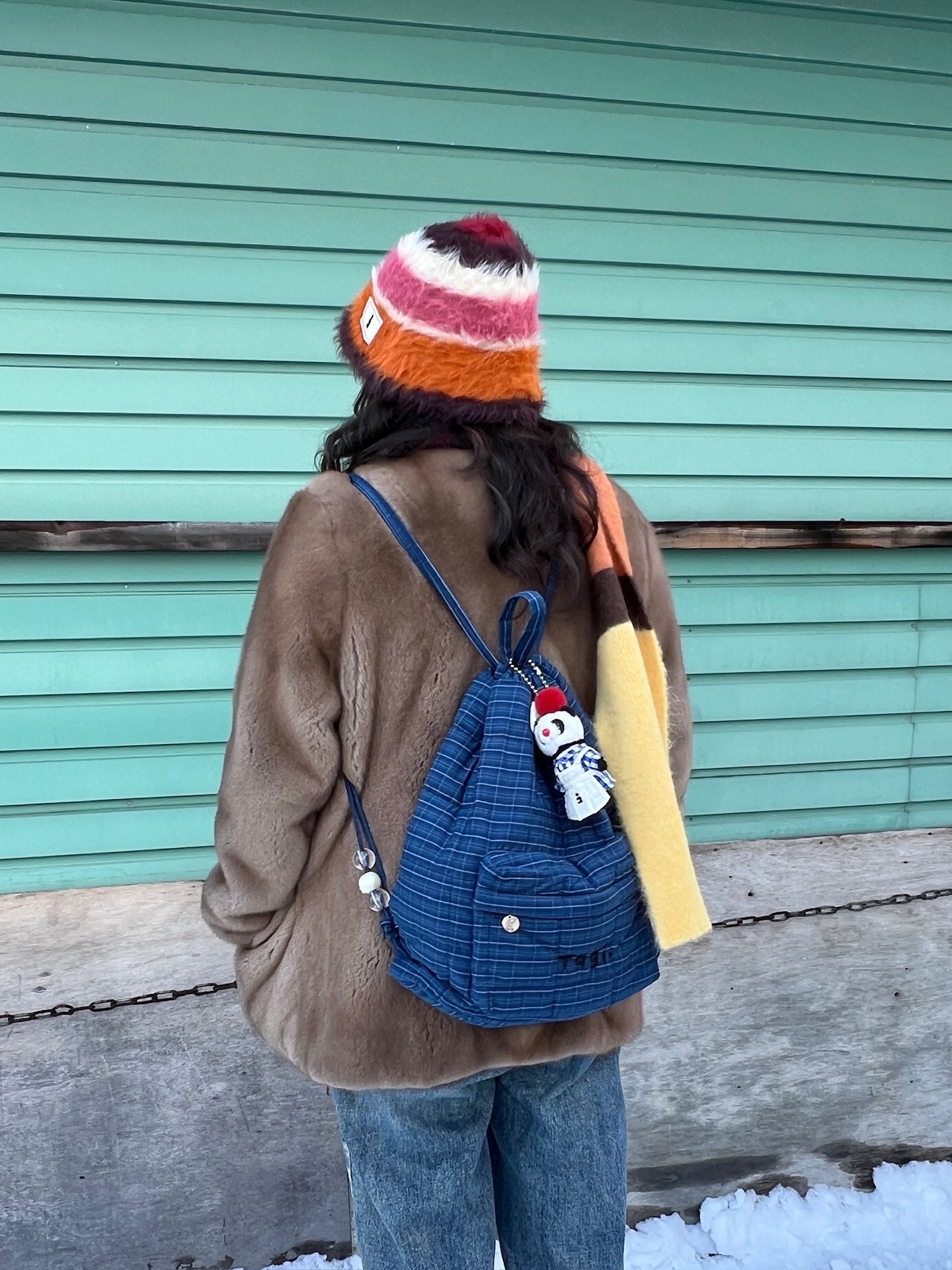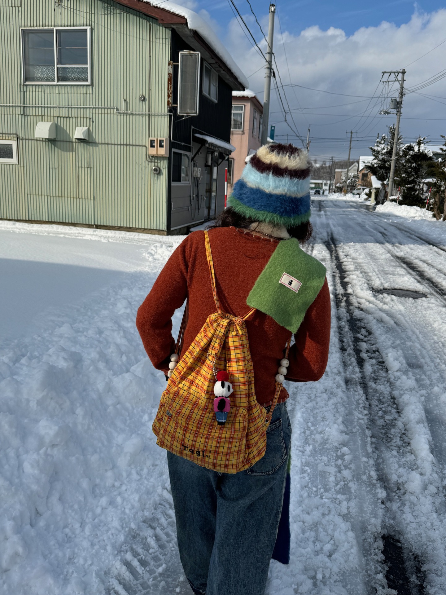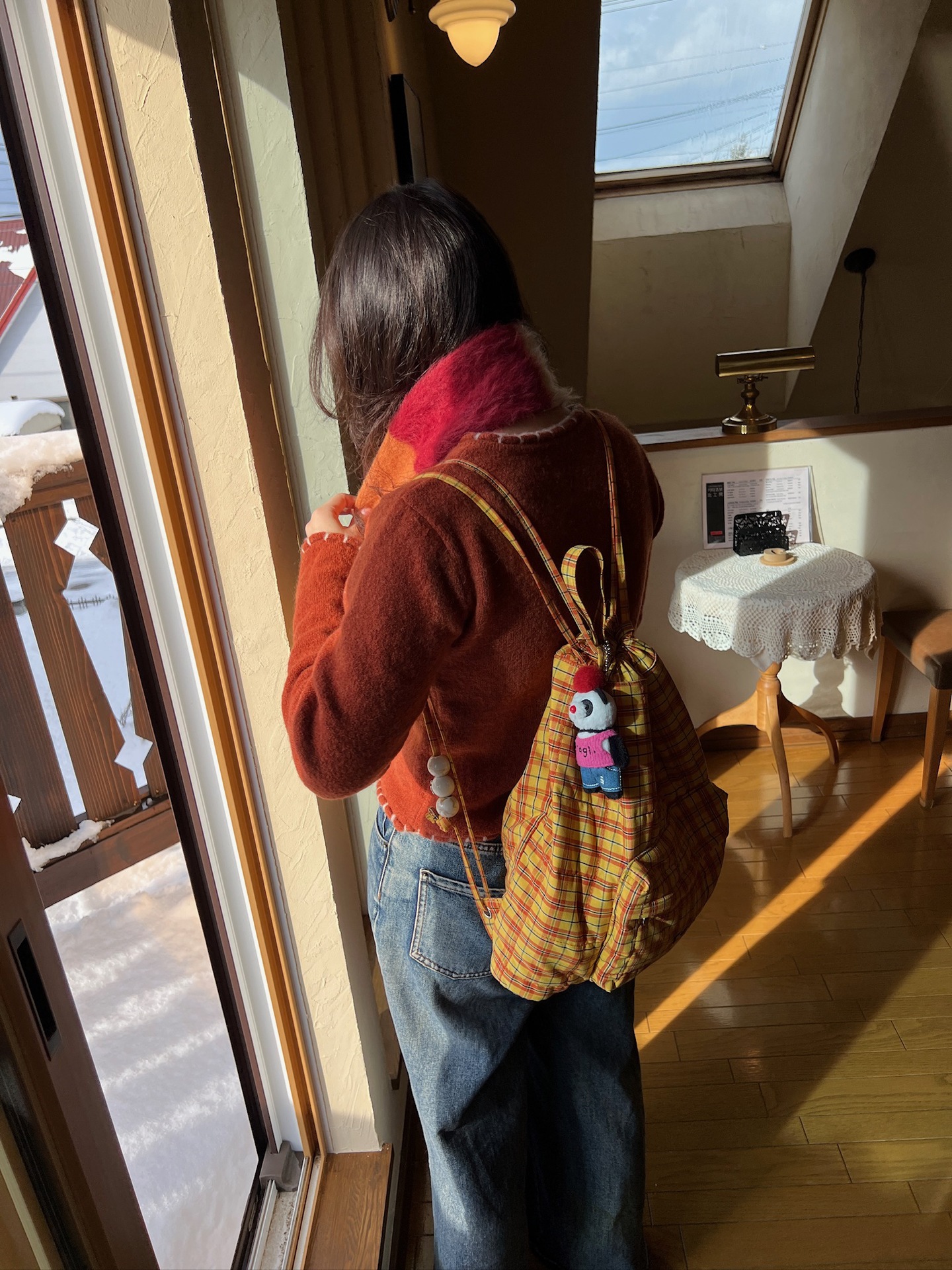 Tagi パールアクリルビーズかわいい巾着キャンバスバッグ大容量バックパックニッチレトロチェック柄オレンジ