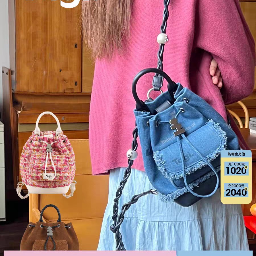 Tagi.Mini画家双肩包手工编织肩带随旅行口袋水桶抽绳束口包