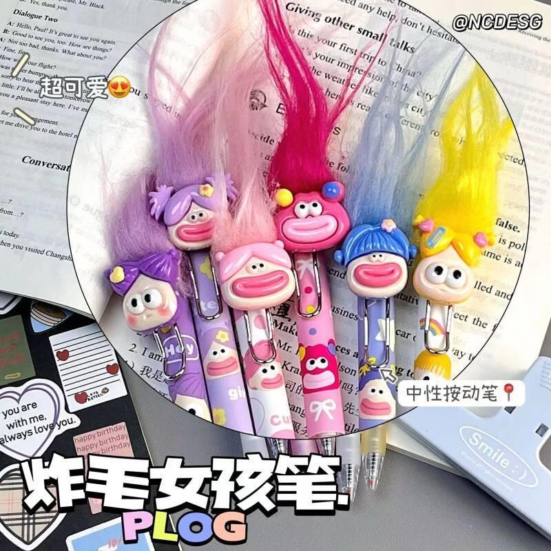 ネットの赤い揚げ毛の人形は楽を貼って中性の筆の大きい口を押します。