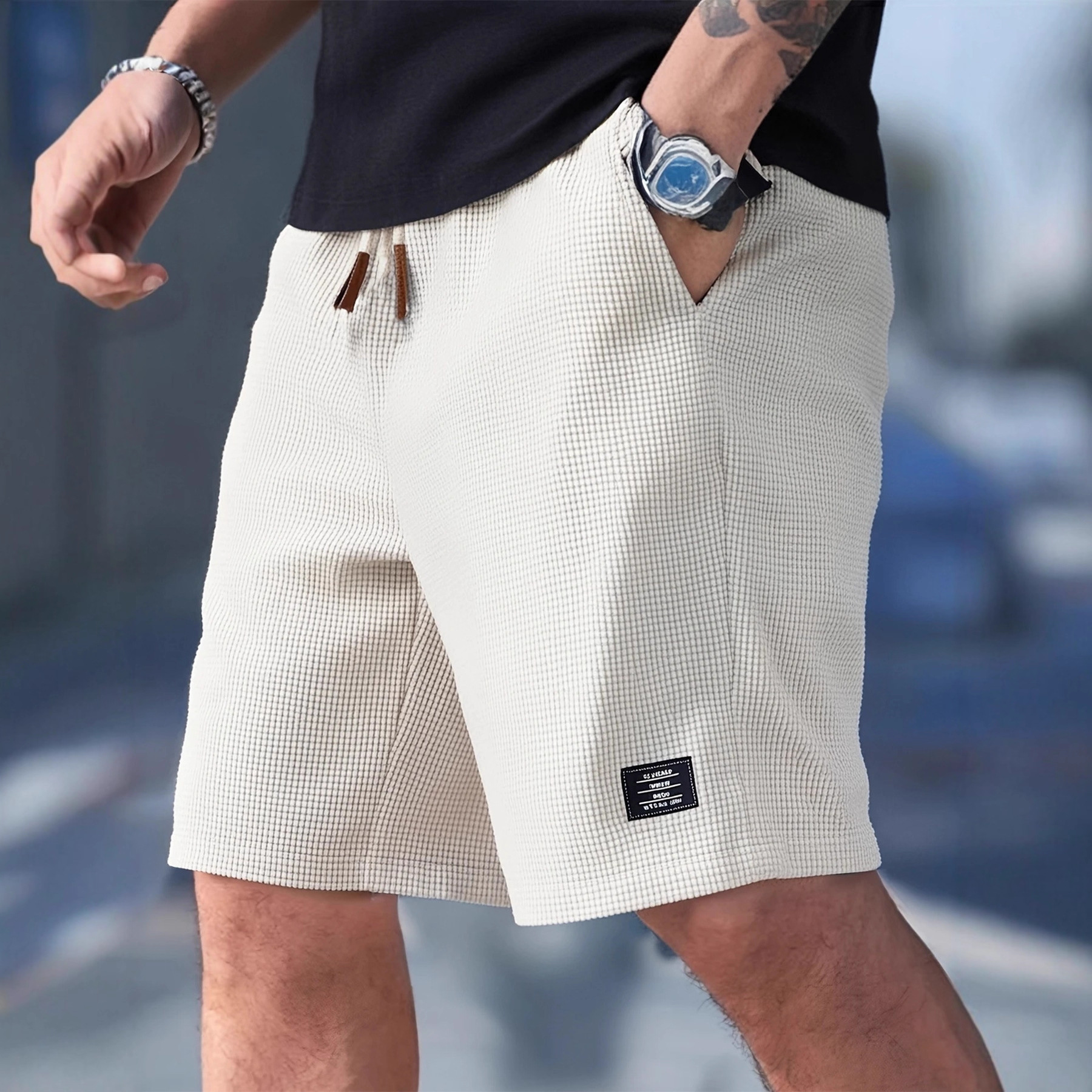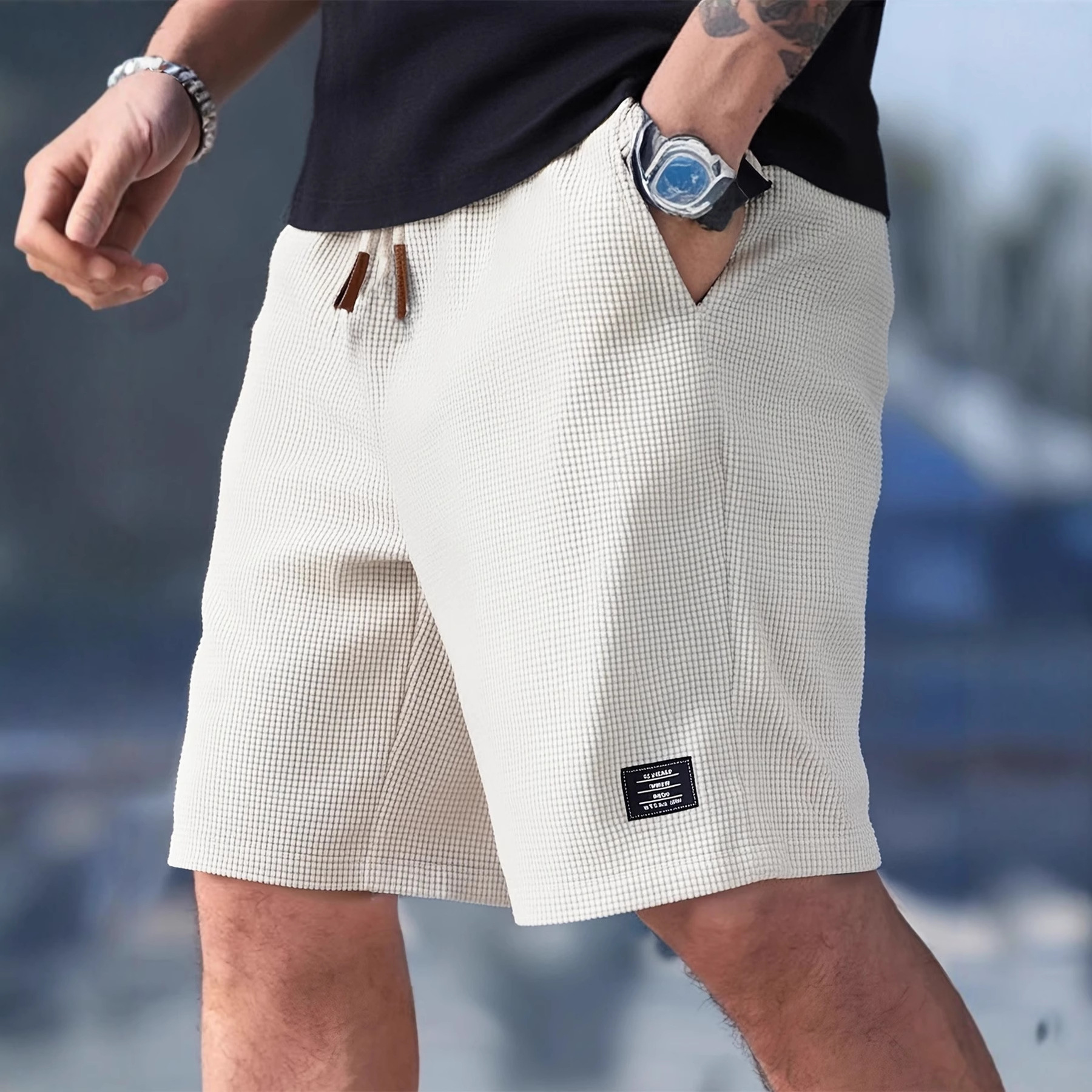 2026新款欧美跨境亚马逊夏季男士简约华夫格刺绣标志休闲纯色短裤