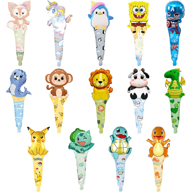 爆発的なアニメは棒の中の棒のアルミの膜の風船を持って手を持って棒を持って露店を出して子供のパーティーの装飾を押します。