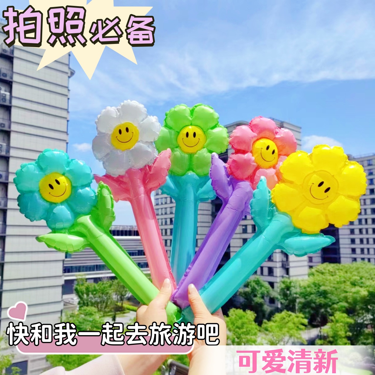 笑顔のデイジーの太陽の花は棒の花の風船を持っています。子供の日に幼稚園の奨励デパートのイベントプレゼントを飾ります。