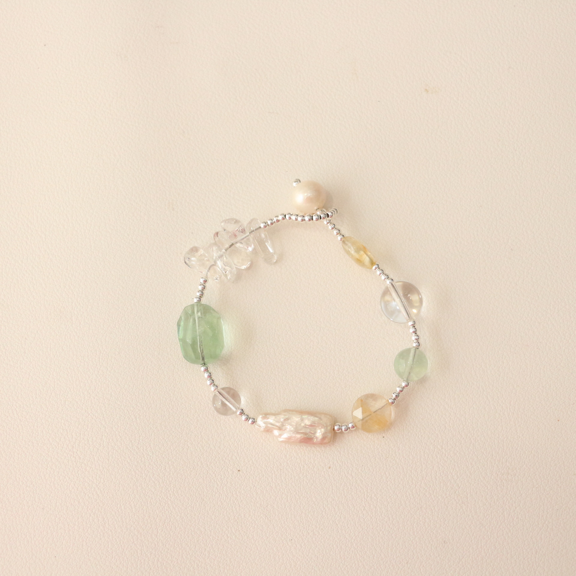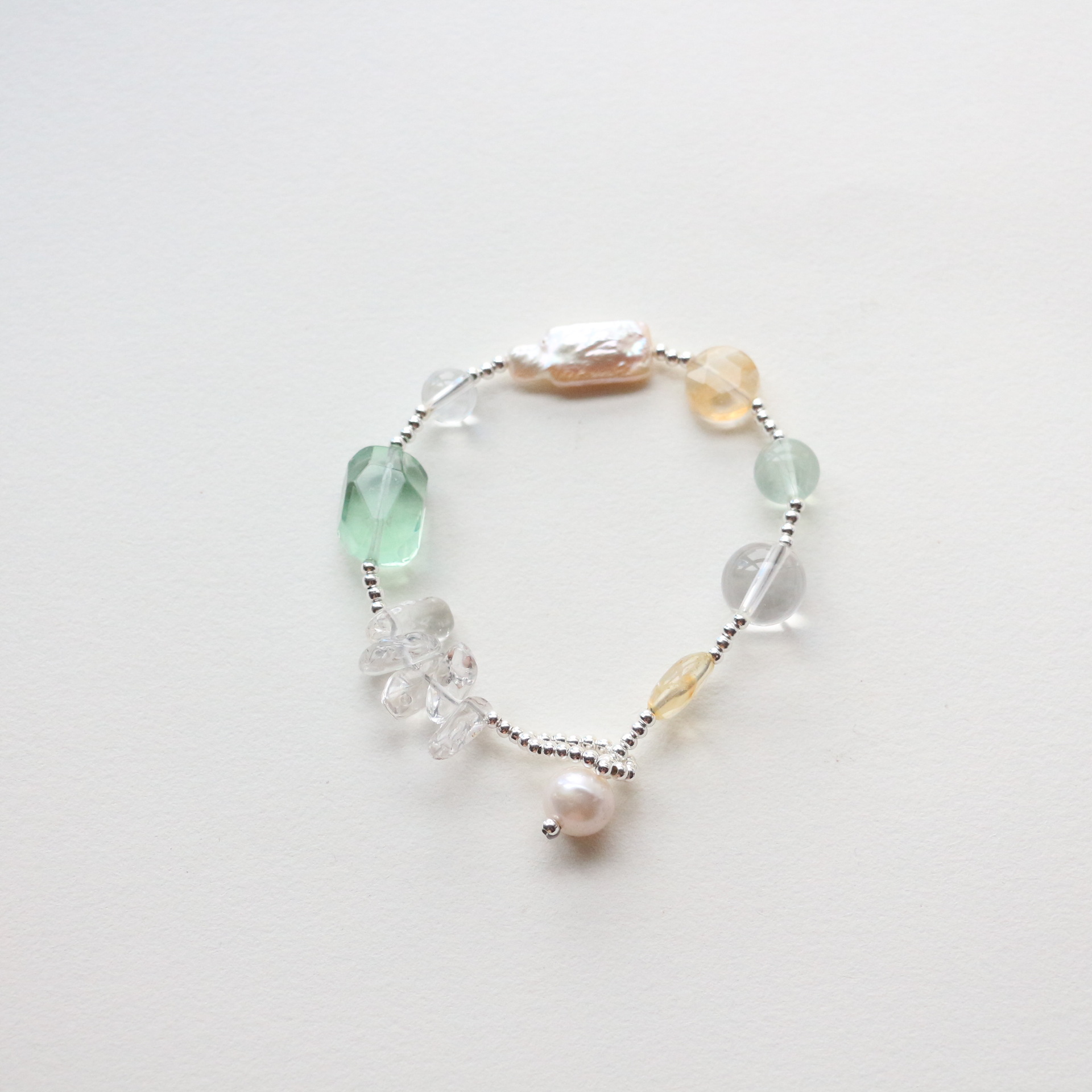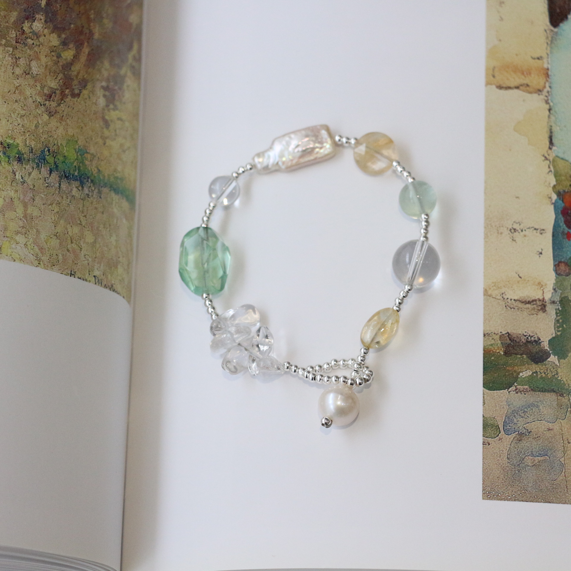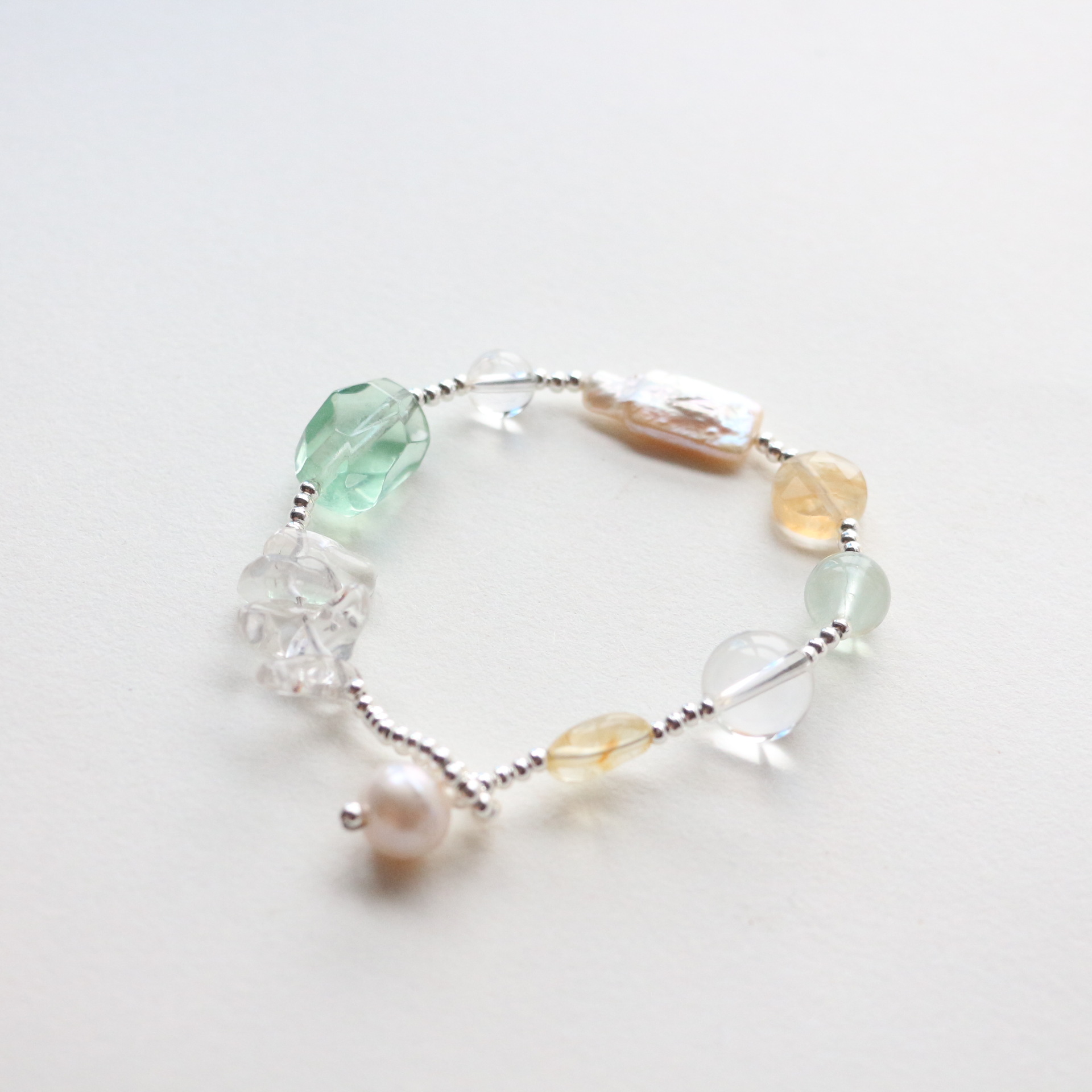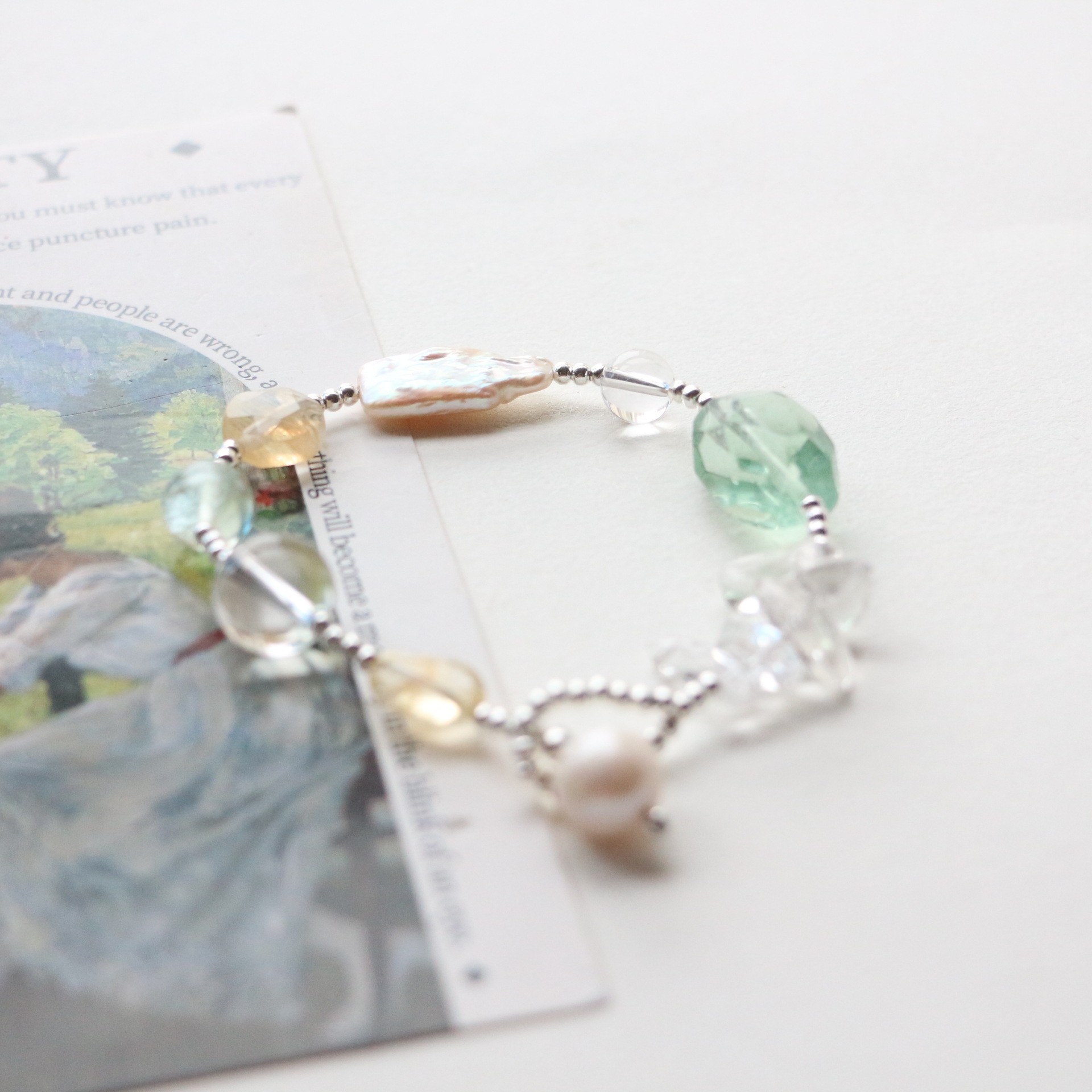 オリジナルデザイン グリーン蛍石 ピュアホワイトクリスタル バロックパール ブレスレット