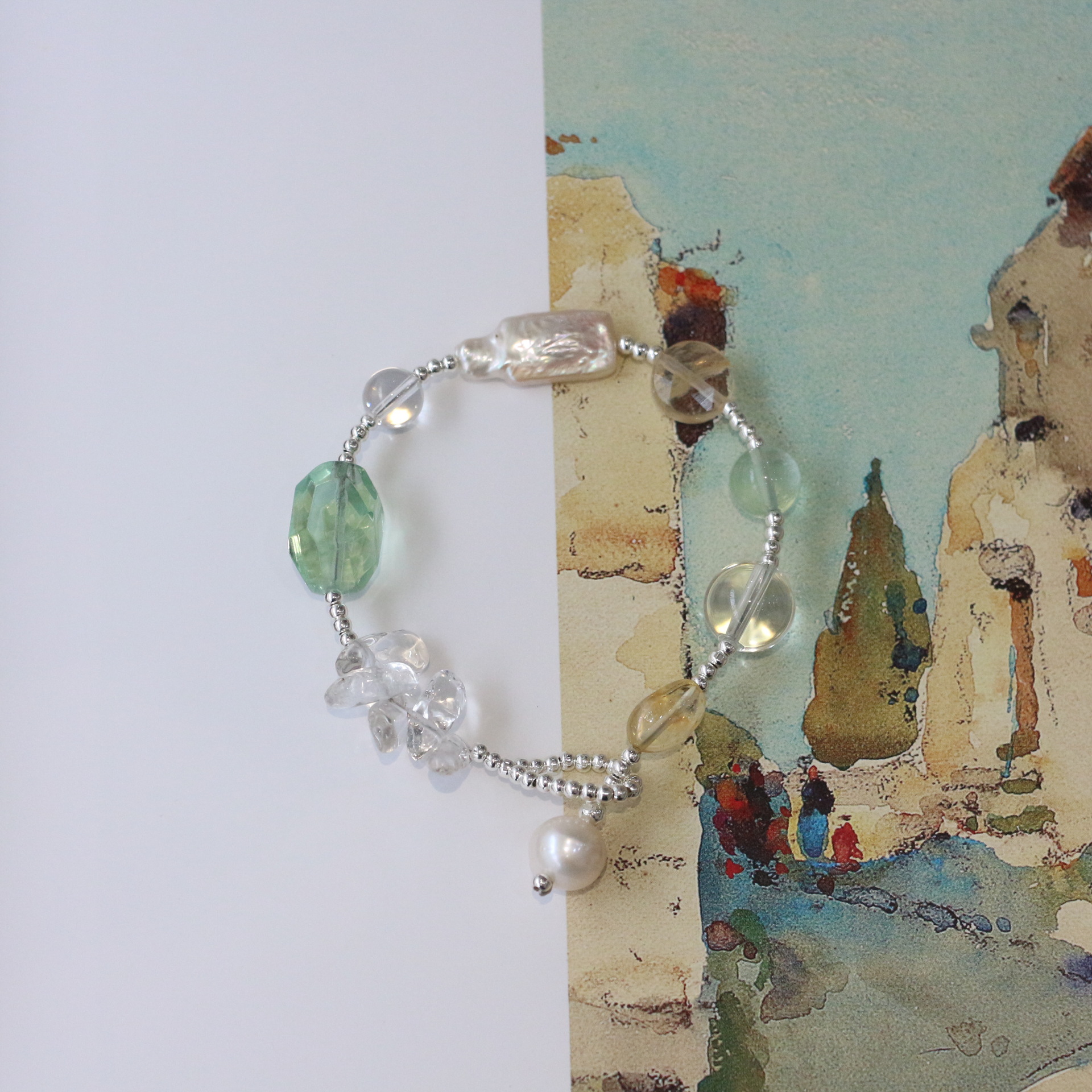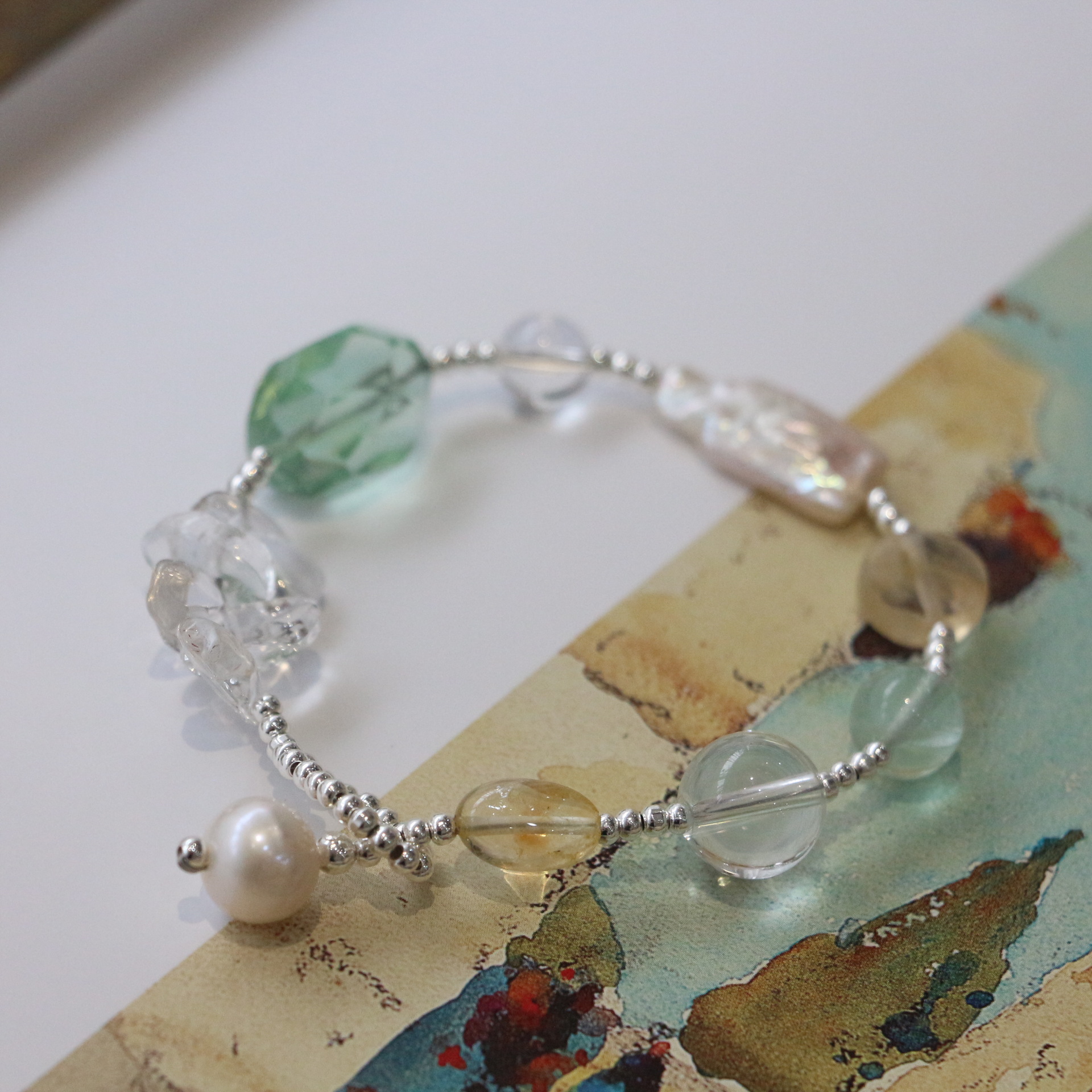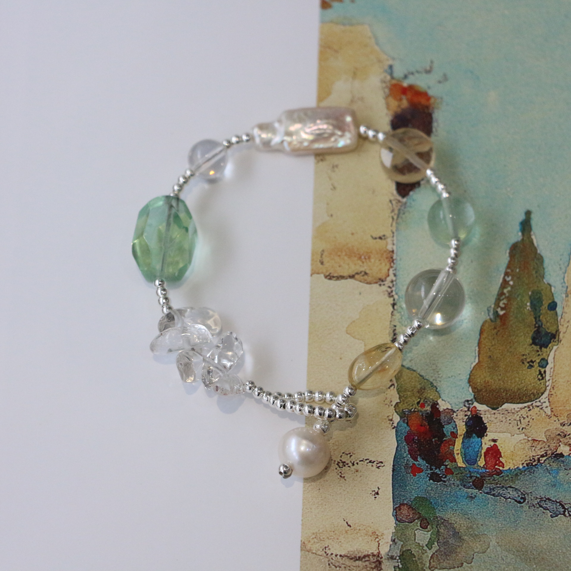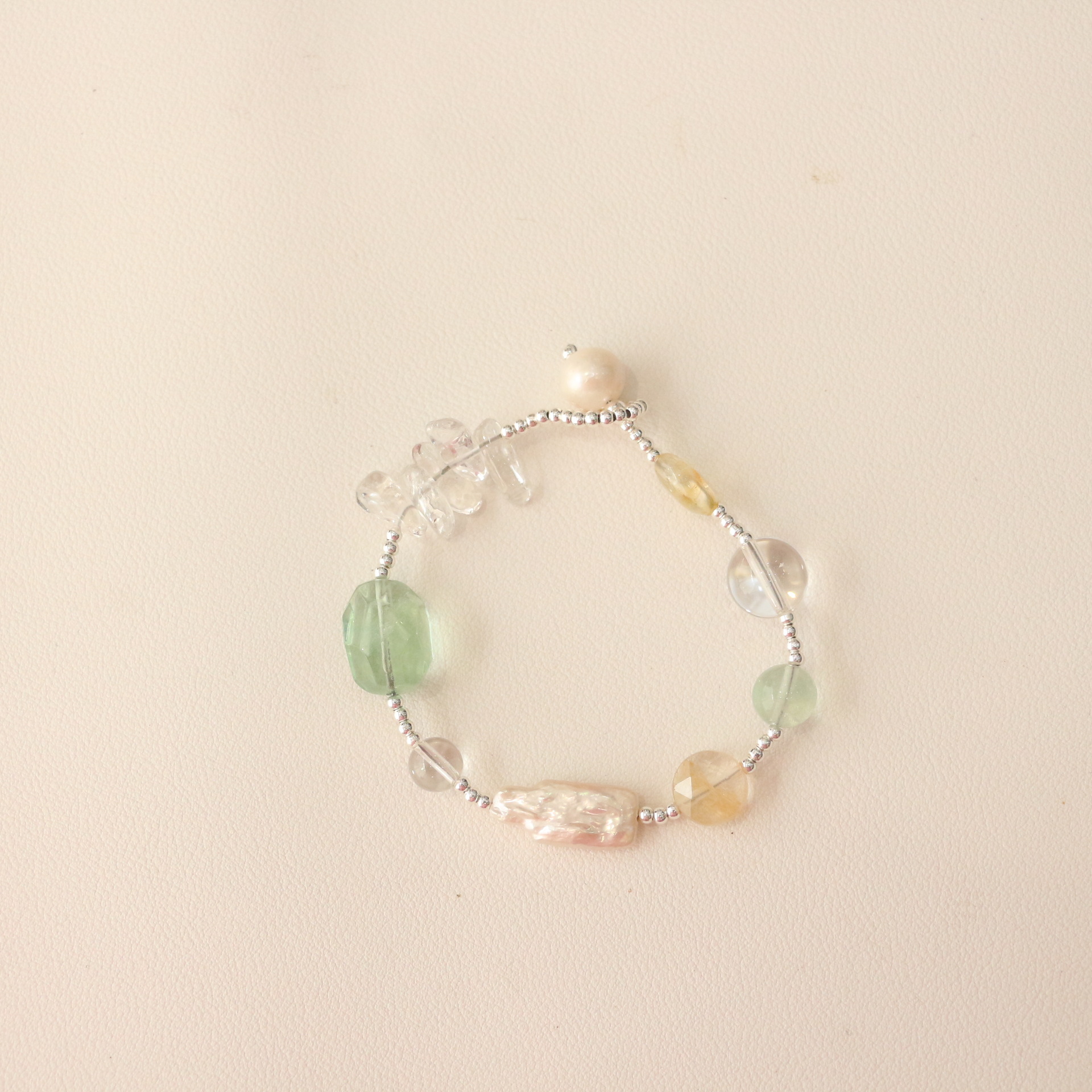 オリジナルデザイン グリーン蛍石 ピュアホワイトクリスタル バロックパール ブレスレット