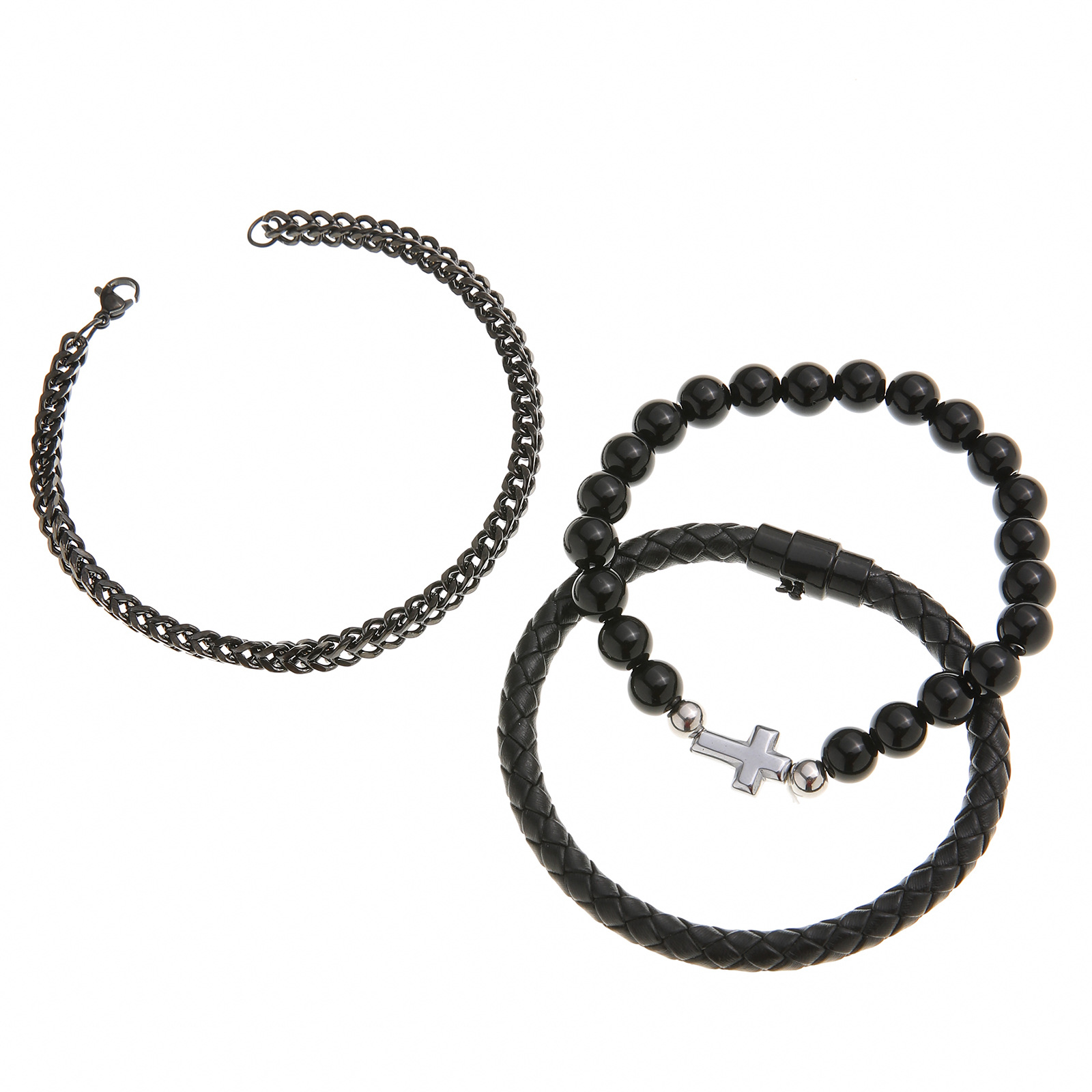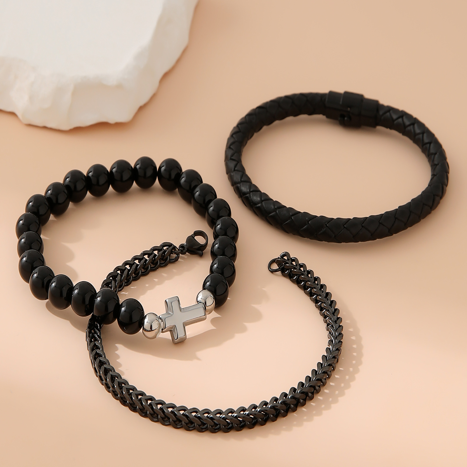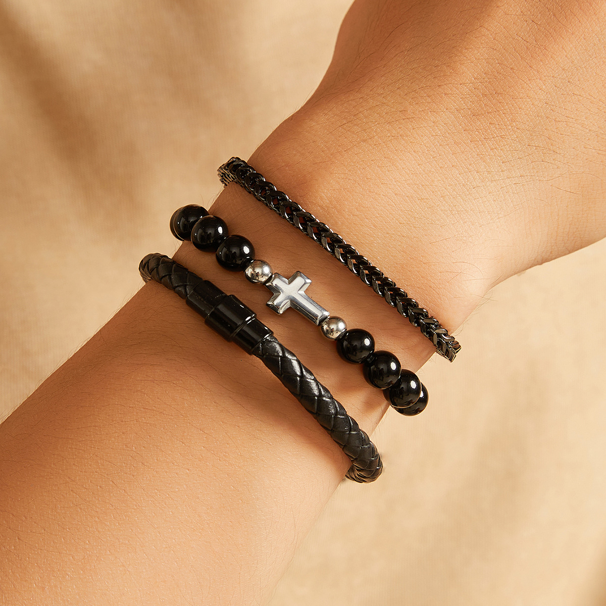 此款产品材质为不锈钢,合金,PU皮绳,手链的长度为18cm,手链的重量为37g,opp袋装!