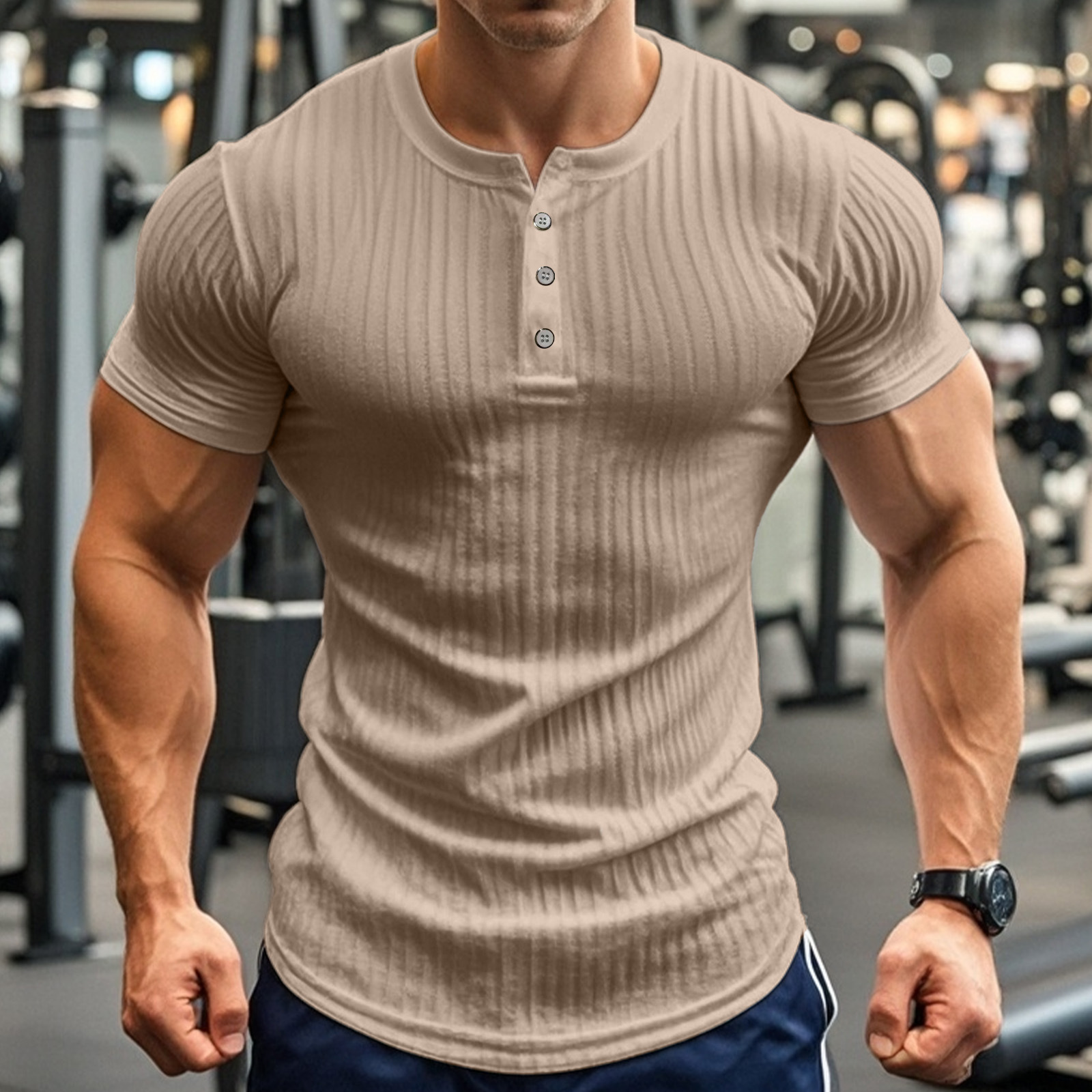 2025年欧米越境貿易メンズサマースポーツカジュアル伸縮性縦縞ボタン半袖フィットネススポーツメンズTシャツ
