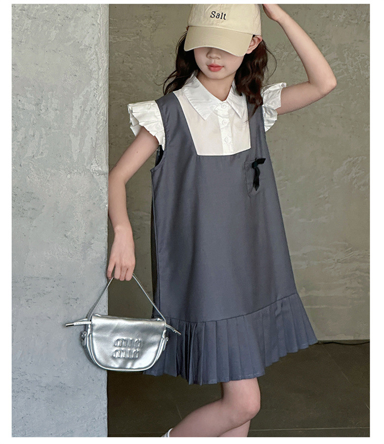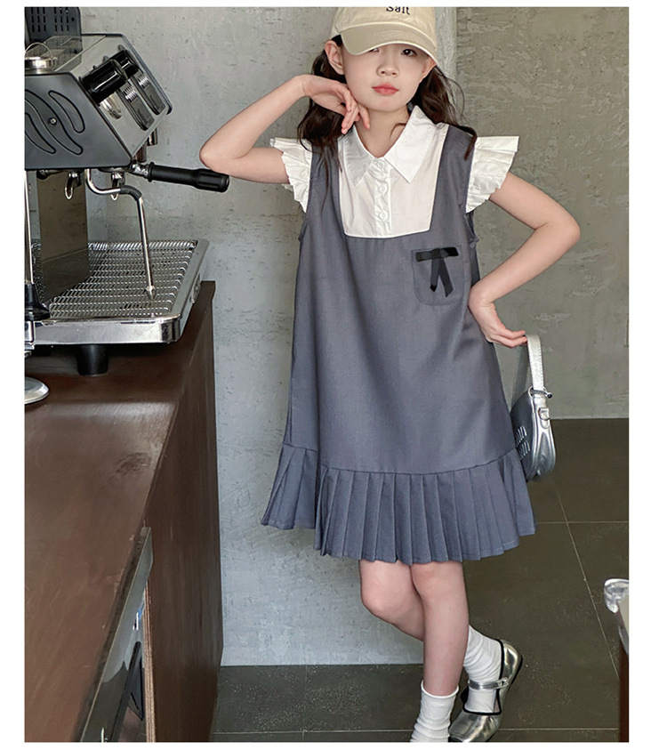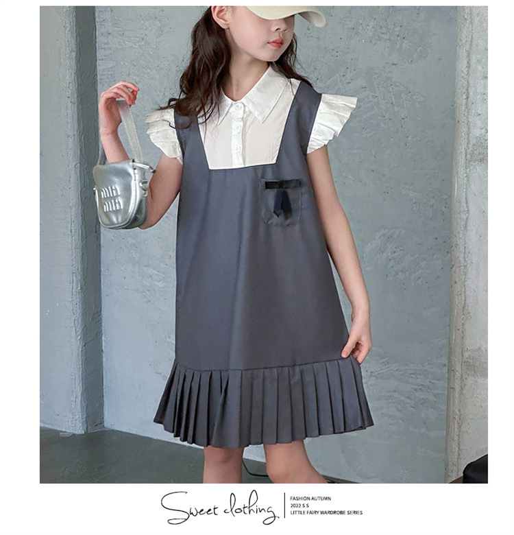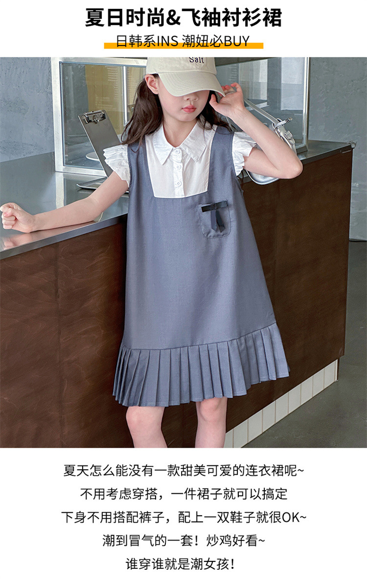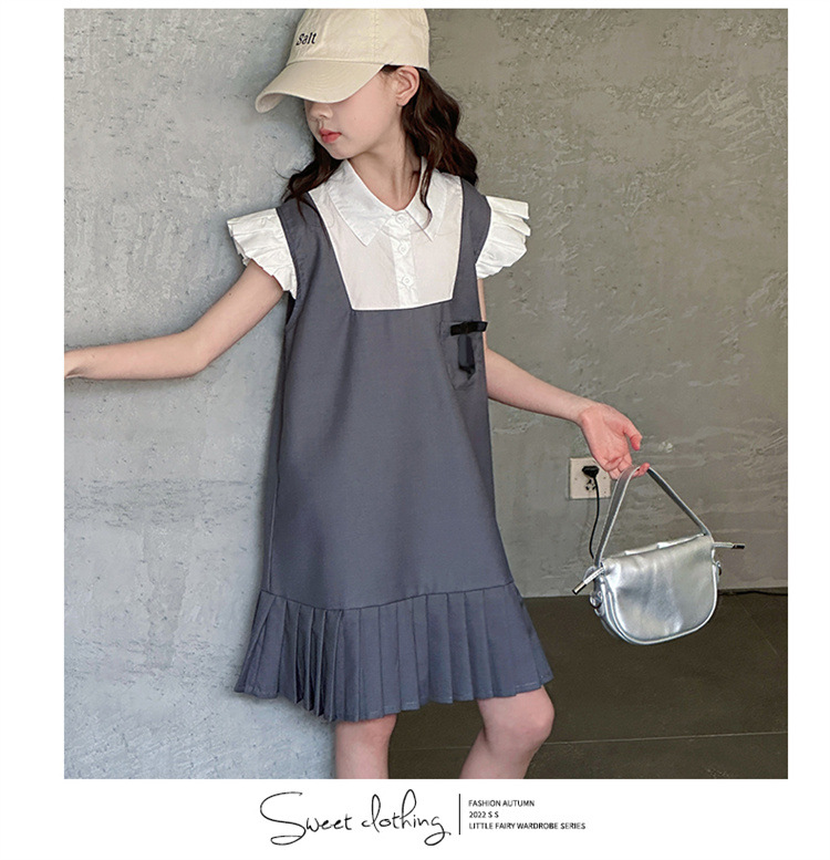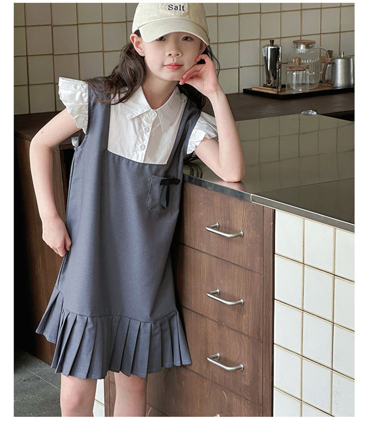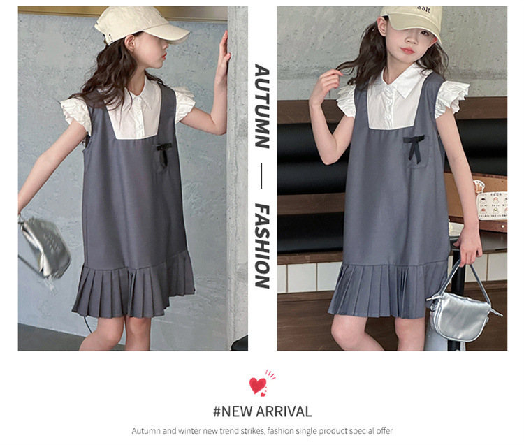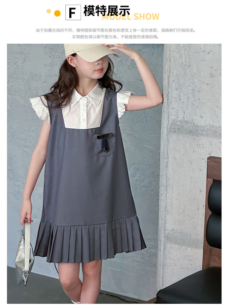 女の子フライングスリーブドレス 2025 夏の新スタイル大きな子供のファッショナブルなカジュアルフェイクツーピースポロスカートシャツスカート
