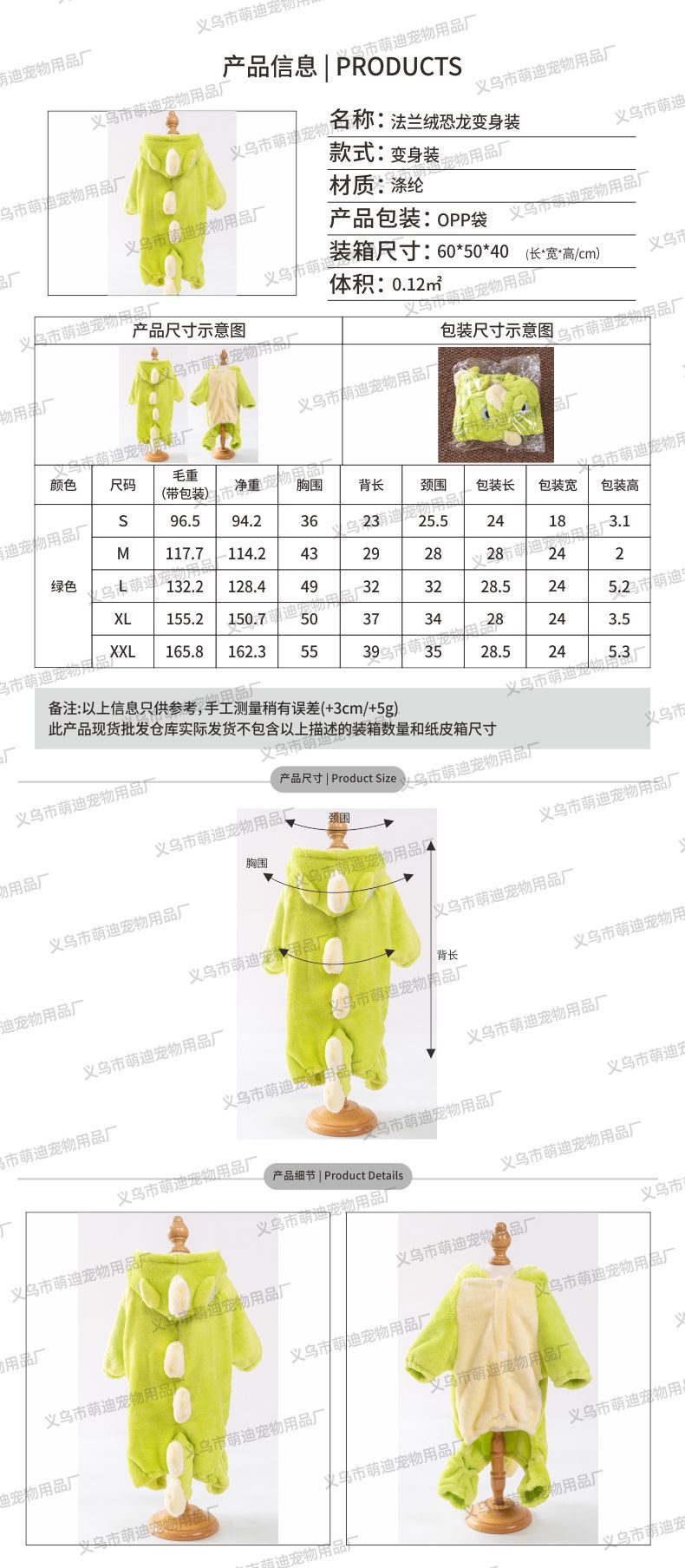 宠物狗狗四脚衣秋冬加绒衣恐龙变身法兰绒猫衣服用品保暖猫咪衣服