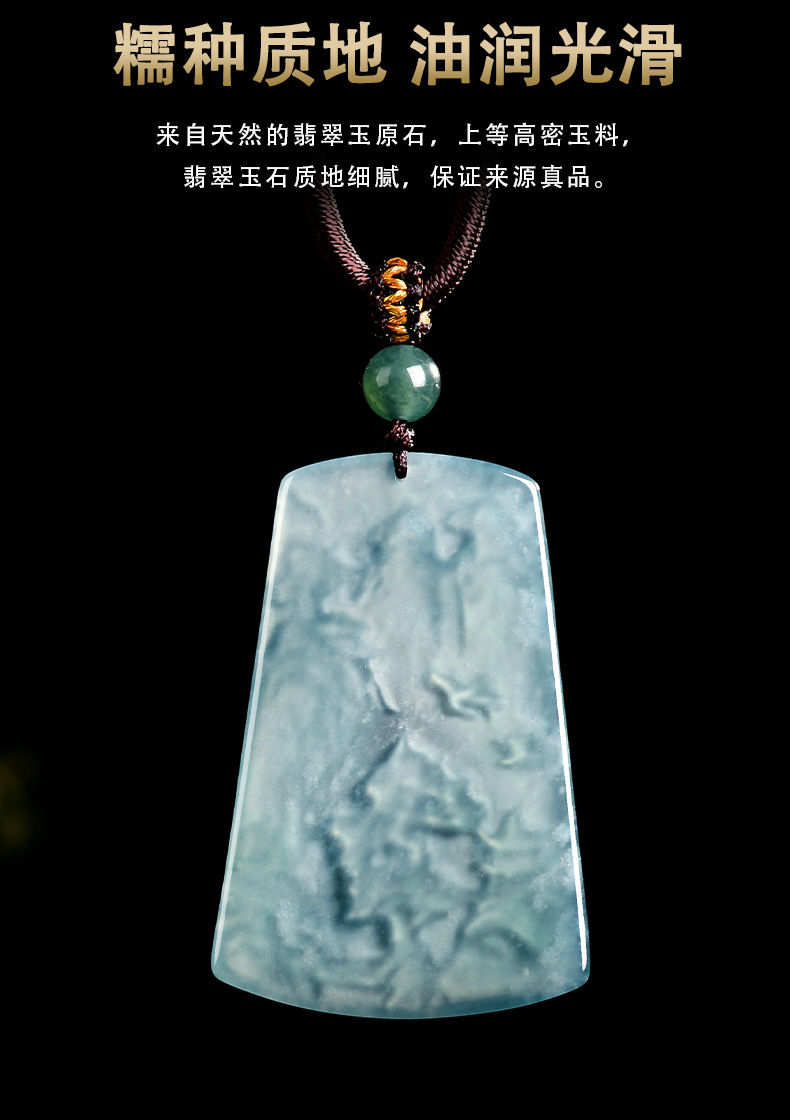 天然翡翠a商品高氷種木那陽緑山水牌ペンダント精彫刻漂花龍牌ペンダント関公男金
