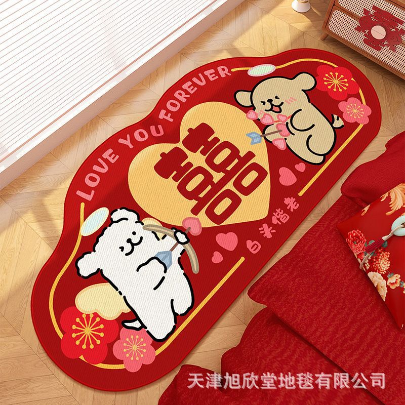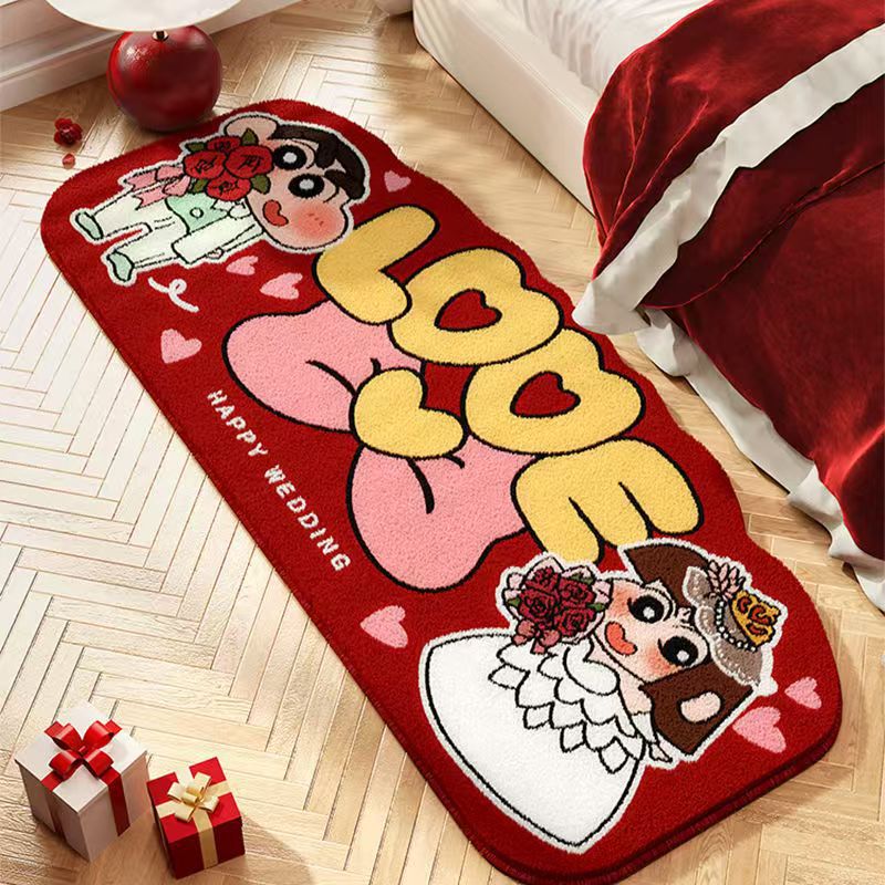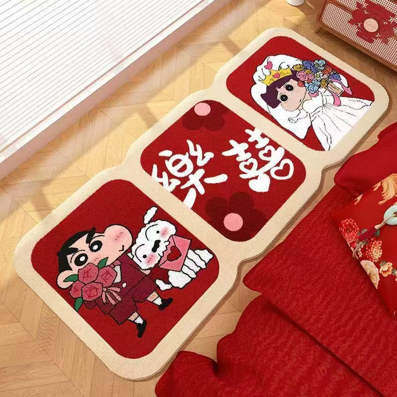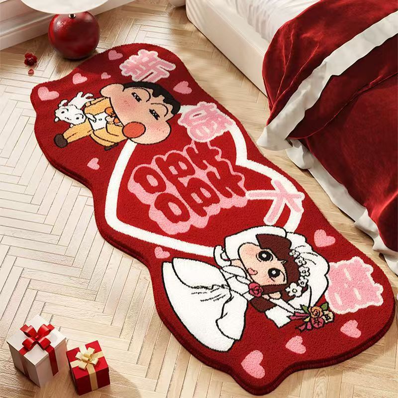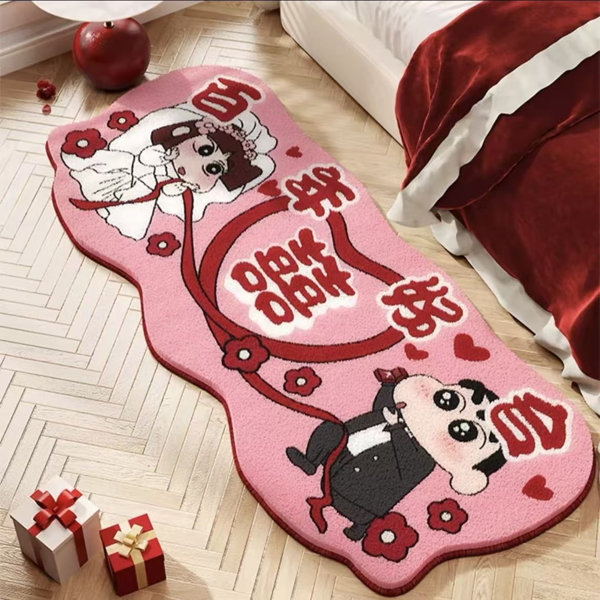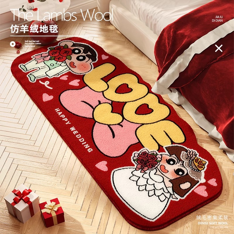 卡通红色结婚氛围地毯卧室床边毯喜庆喜字仿羊绒床边地垫飘窗垫