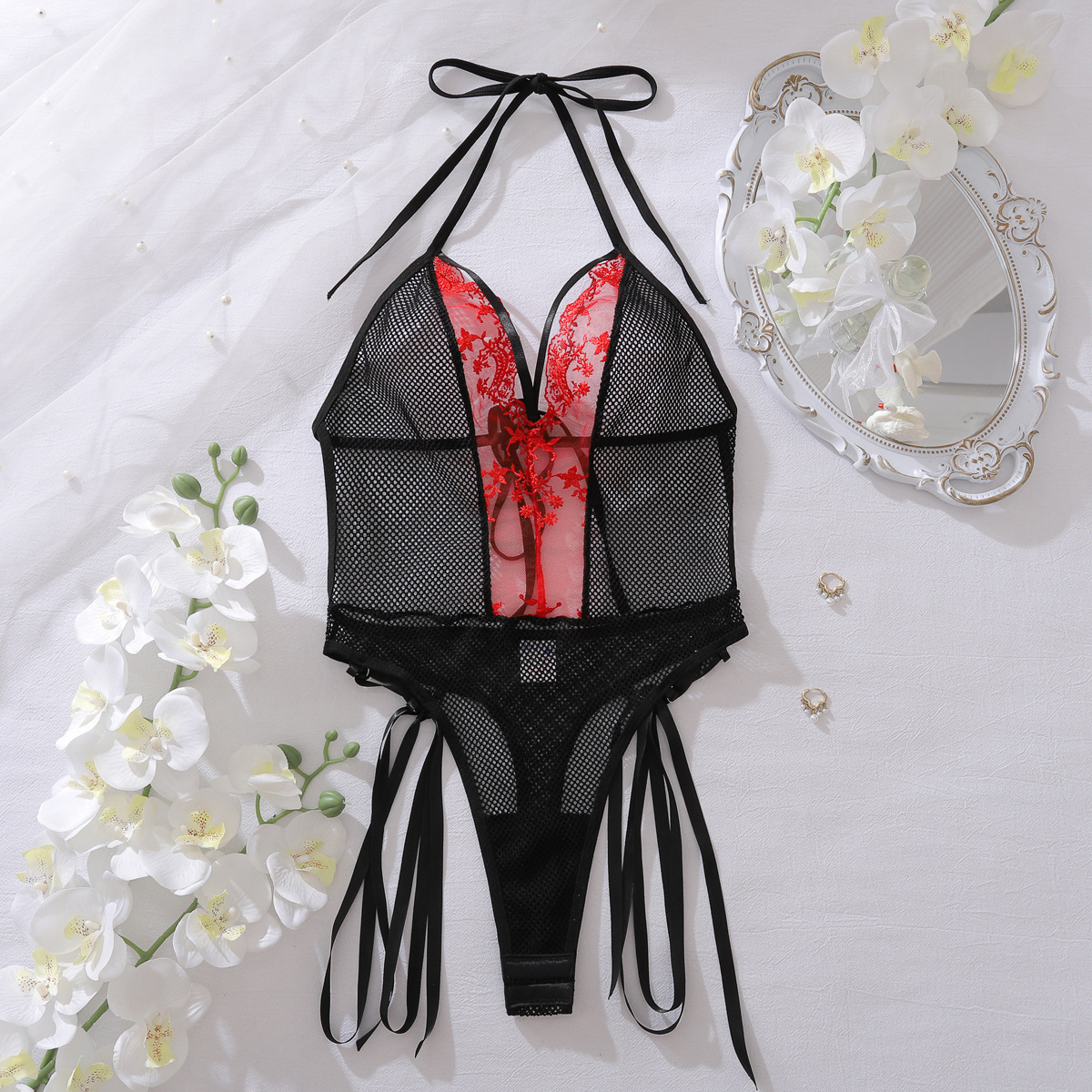欧美跨境2025高品质黑红撞色刺绣塑身女神气场款挂脖系带连体衣