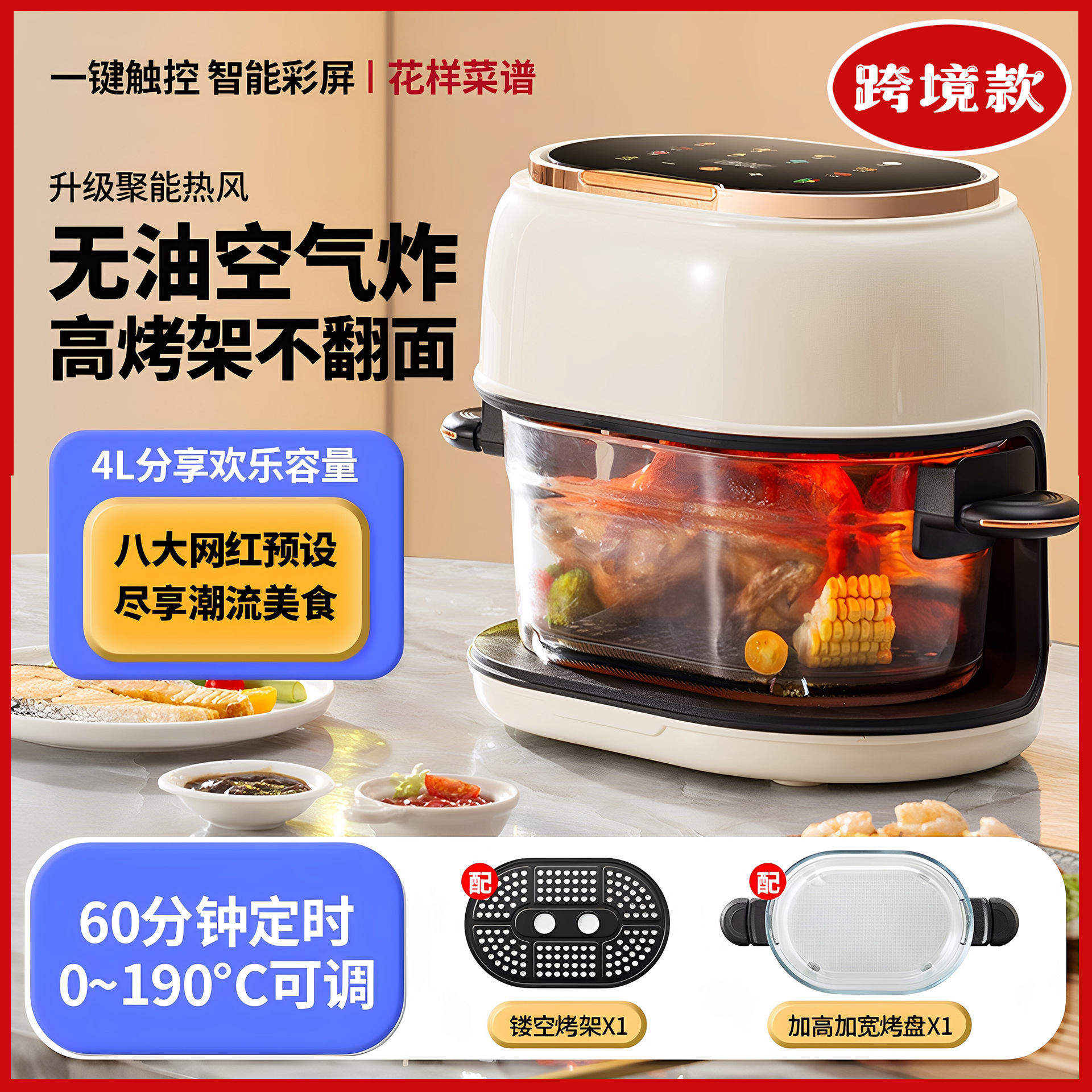 110V 新しいエアフライヤー、油煙なし、高ホウケイ酸ガラス、大容量電気オーブン、完全に見える 220V 電気フライヤー