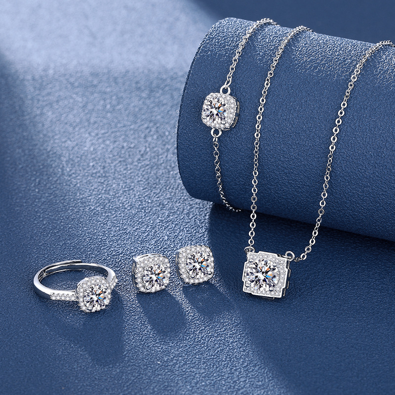 八心八箭套装镀PT950仿真美国高碳钻方钻项链耳钉四件套开口戒指