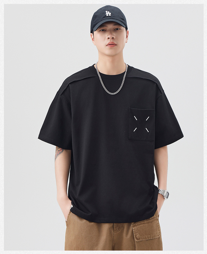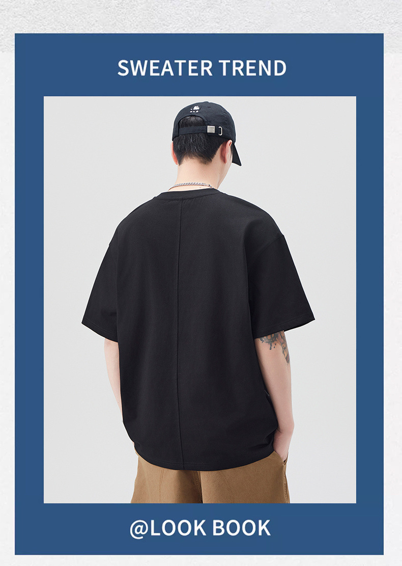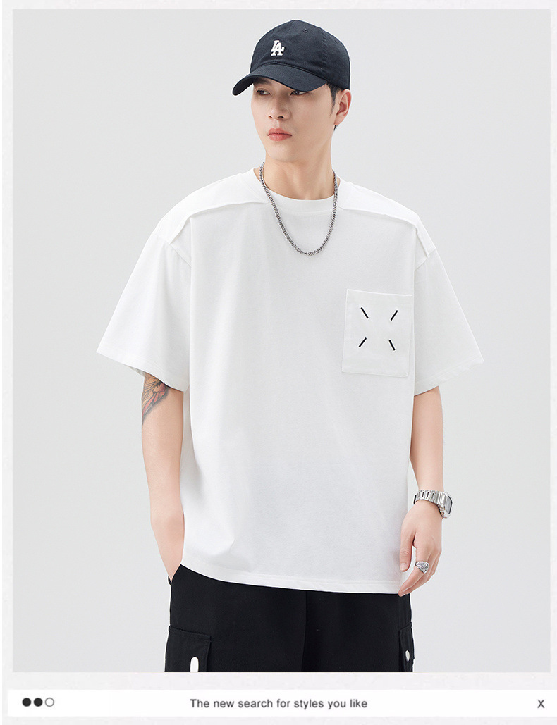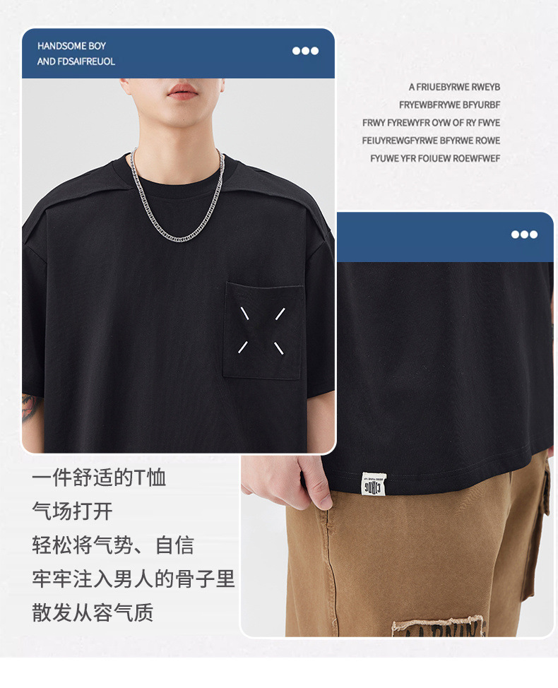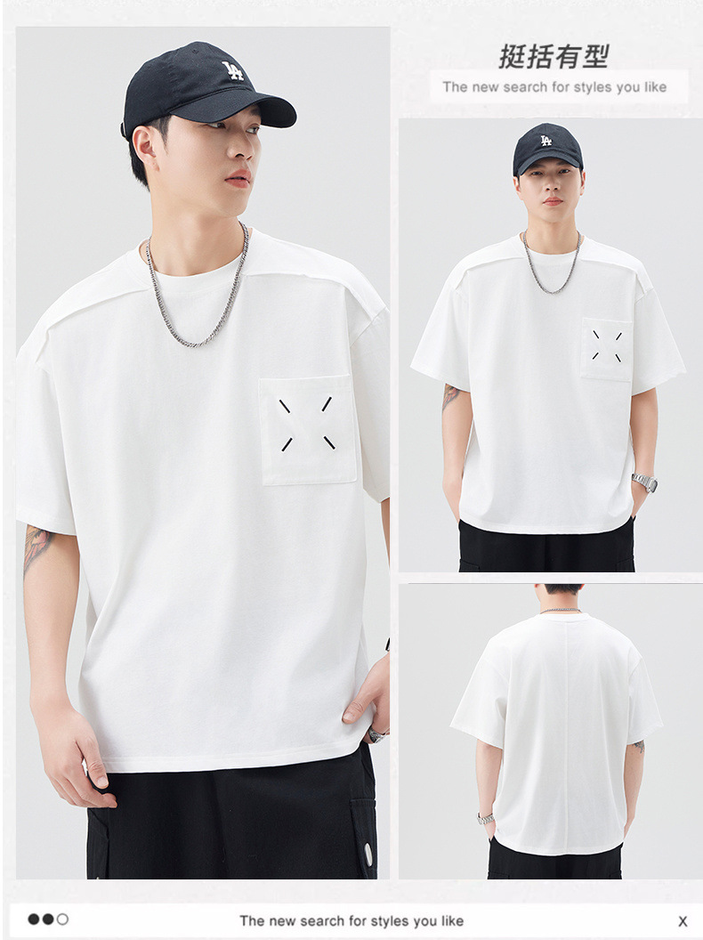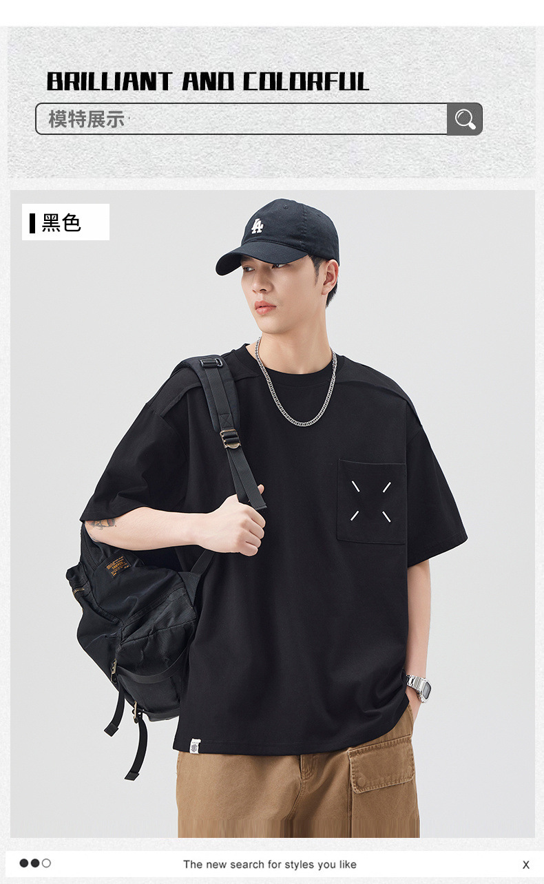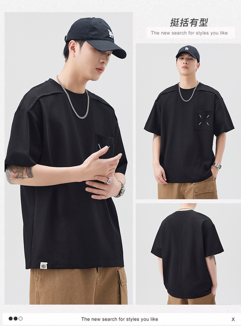 新品夏季潮牌纯色拼接T恤短袖男宽松舒适百搭休闲潮流港风上衣男