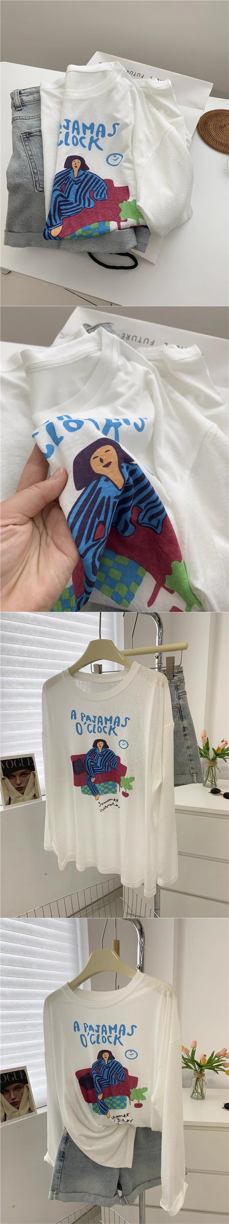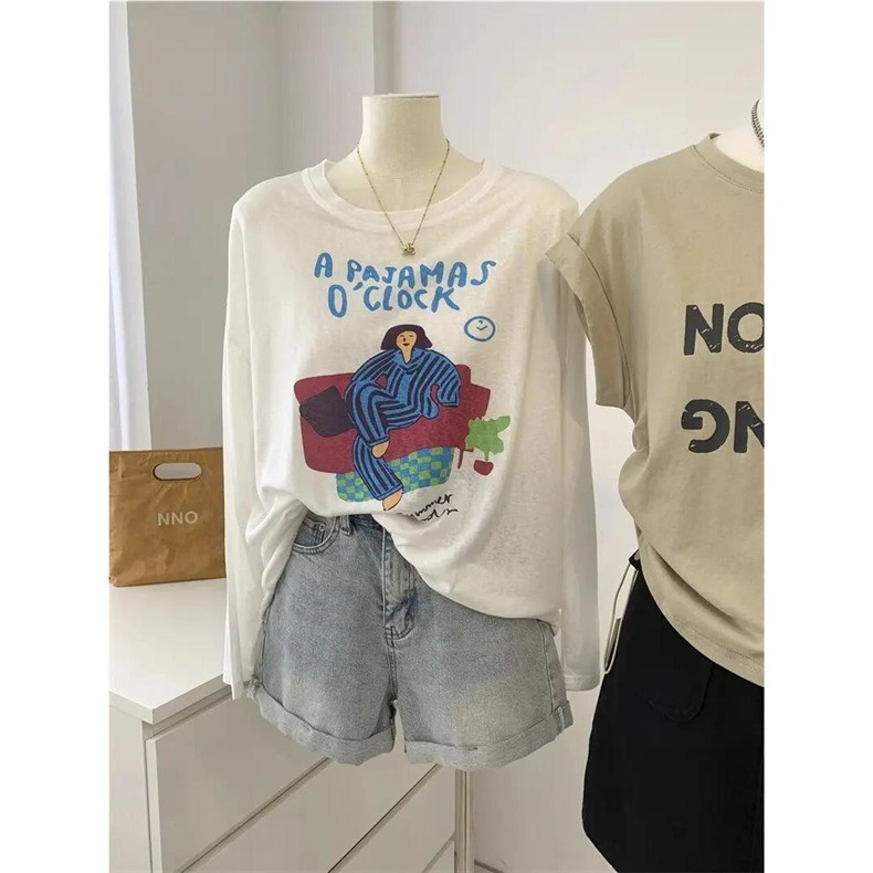 女性のための白いルーズプリント年齢軽減日焼け止め Tシャツ 2025 夏の新しいラウンドネック長袖レイジーデザイントップ