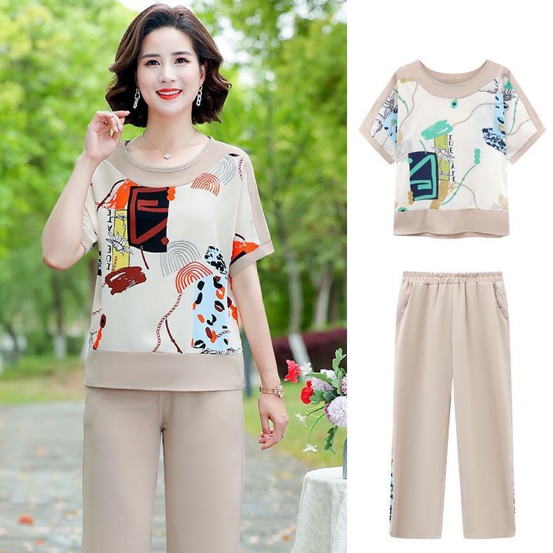 母の日 ママ 夏 シフォンスーツ 洋風 中高年女性 トップス ミディアム 半袖 Tシャツ 2点セット おしゃれで万能