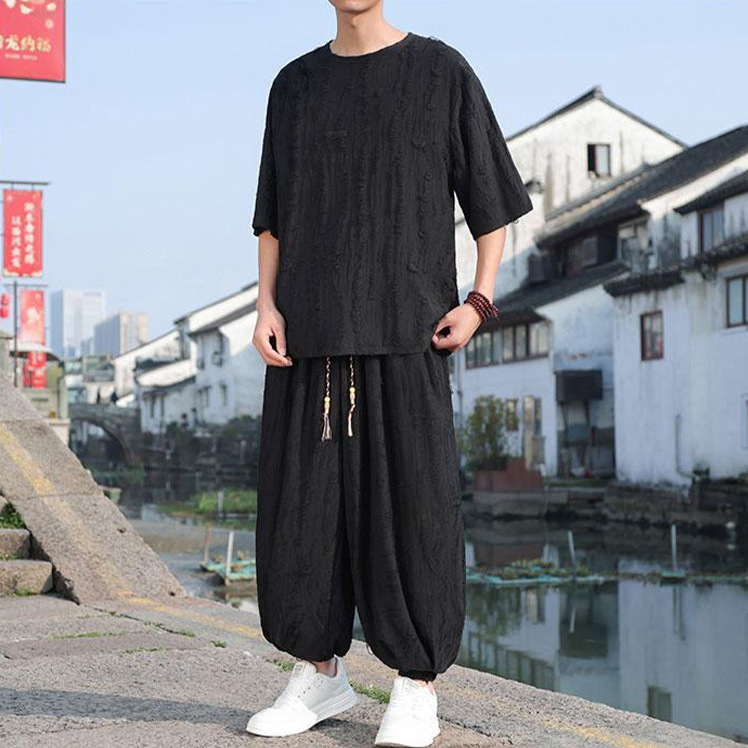 中国風の漢服スーツメンズ夏薄い半袖ズボンカジュアルファッションライト高級 Tシャツリッピングツーピースセット
