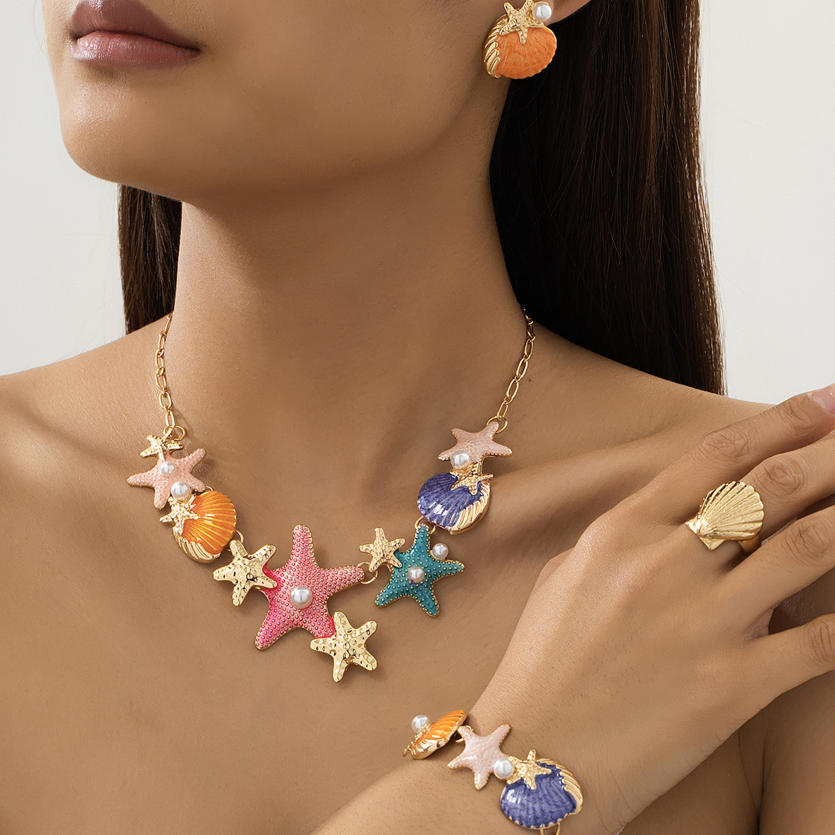 欧米の国境を越えたカラーの滴る海星の貝殻のネックレスのブレスレットのピアスは誇張して真珠のビーチのリゾート風の装飾品をはめ込んでいます。