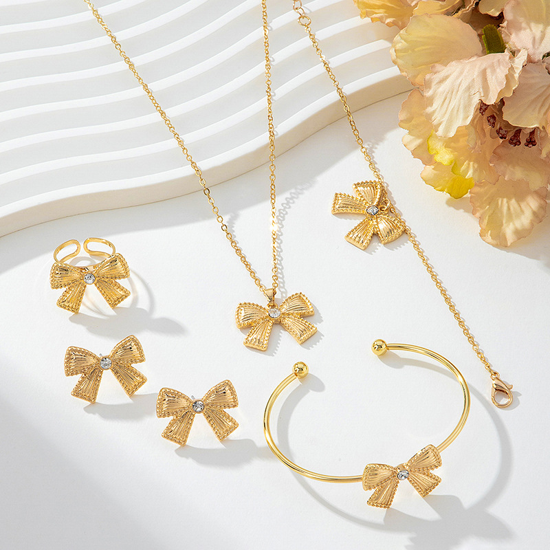 国境を越えた欧米の金色のジュエリーセット卸売り気質の甘い蝶ネクタイのネックレスの鎖のピアスの指輪の5点セット