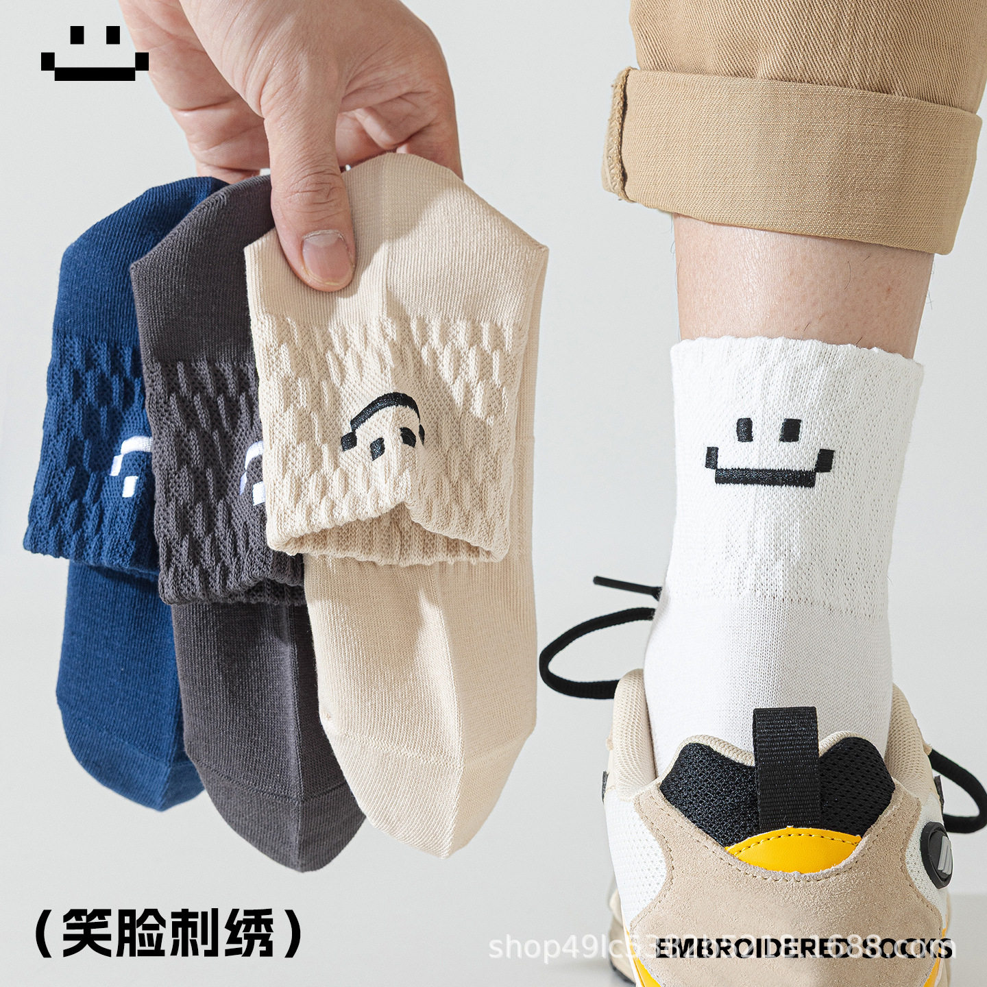 新款潮流刺绣秋冬季中筒袜中性风男款防滑防磨笑脸袜简约百搭棉袜